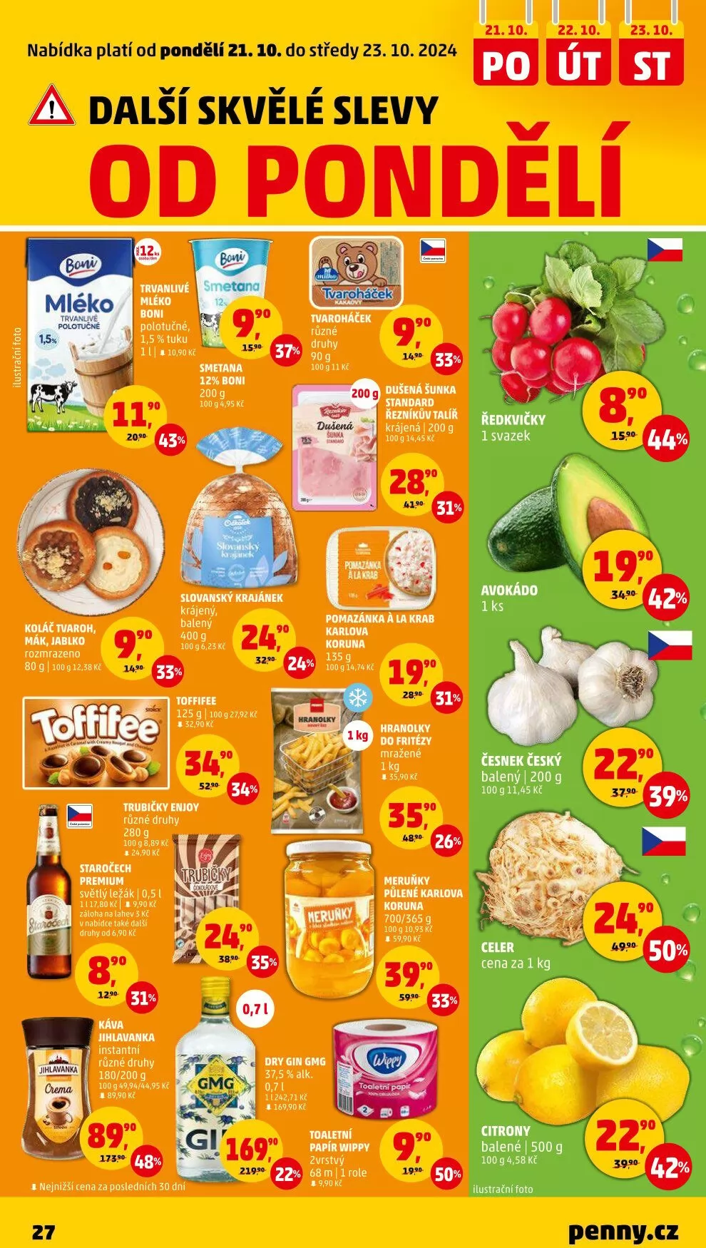 V letáku obchodu Penny Market na období od 21. do 23. října 2024 najdete skvělé slevy na široký sortiment produktů. Můžete si zakoupit trvanlivé polotučné mléko Boni, tvarohové koláče s mákem a jablky, nebo smetanu Boni. Dále je v nabídce dušená šunka, krájený řezníkův talíř a pomazánka á la krab od Karlovy koruny.