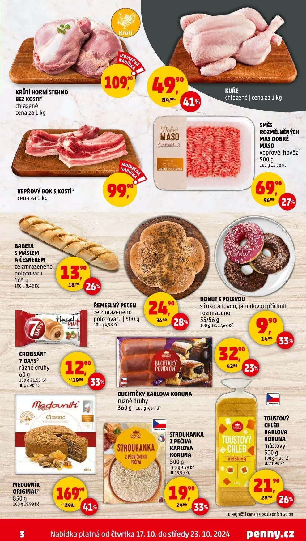 V letáku obchodu Penny Market najdete širokou nabídku kvalitních produktů. Mezi nimi se nachází krůtí horní stehno bez kosti, chlazené, za cenu 99,90 Kč za kilogram. Dále nabízíme vepřový bok s kostí, cena za kilogram je 49,90 Kč.