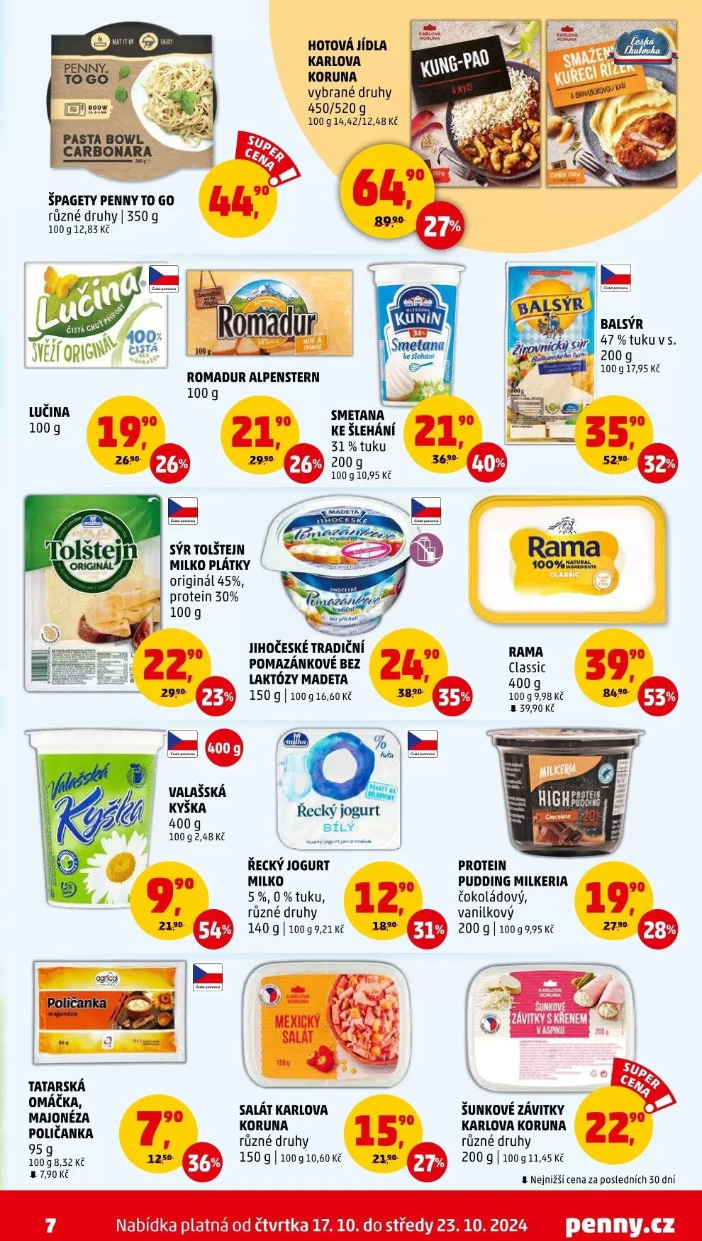 V nabídce najdete i různé druhy jogurtů, salátů a omáček, které obohatí váš jídelníček. Akce platí od čtvrtka 17.10. do středy 23.10. Nepropásněte skvělé ceny a kvalitní produkty!