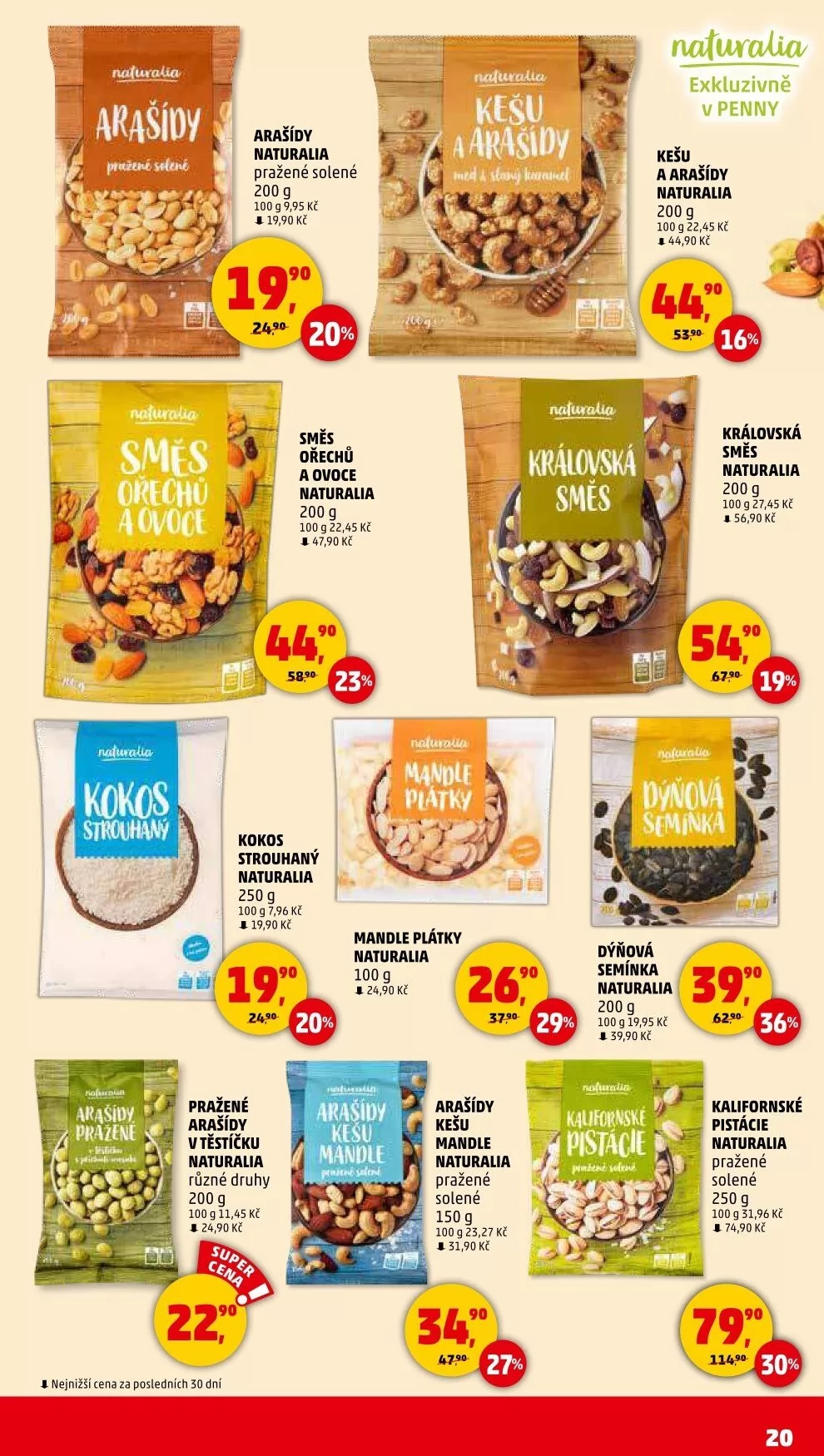 V letáku obchodu Penny Market najdete širokou nabídku produktů značky Naturalia. Mezi nimi jsou například pražené solené arašídy v balení 200 g za 19,90 Kč, nebo směs ořechů a ovoce, která je k dispozici také v 200 g balení za 47,90 Kč.