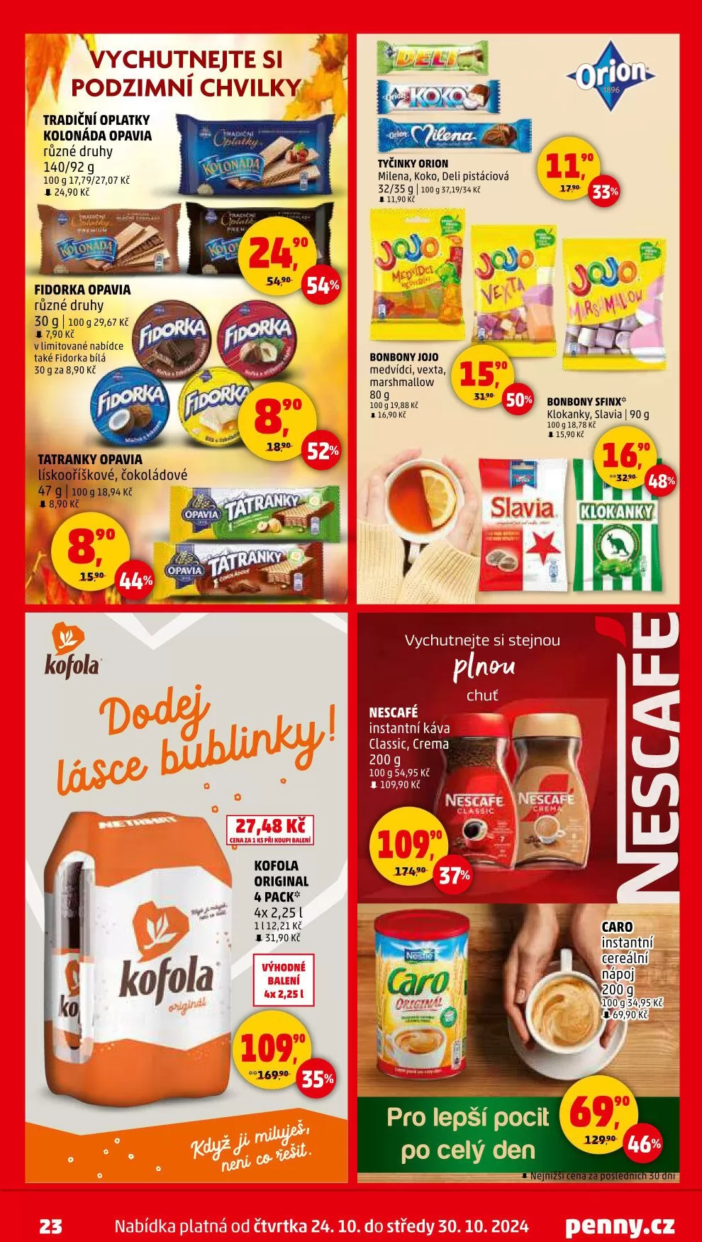 V letáku obchodu Penny Market najdete širokou nabídku chutných produktů, které si můžete vychutnat během podzimních chvilek. Mezi tradičními oplatkami Kolonáda Opavia si můžete vybrat různé druhy za 24,90 Kč. Nezapomeňte také na Fidorku Opavia, která je k dostání v limitované nabídce, včetně bílé varianty, a to za 7,90 Kč.