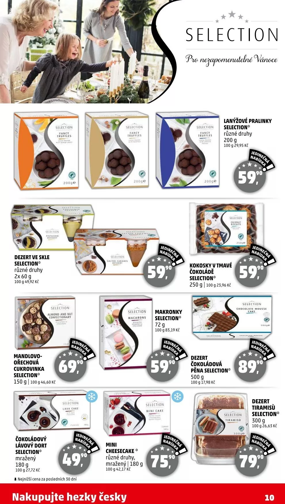 V letáku obchodu Penny Market najdete širokou nabídku lahodných dezertů ve skle, které jsou k dispozici v různých druzích. Mezi nimi se nachází makronky, lanýžové pralinky a kokosky v tmavé čokoládě. Nechybí ani čokoládový lávový dort a dezert čokoládová pena, které potěší každého milovníka sladkostí.