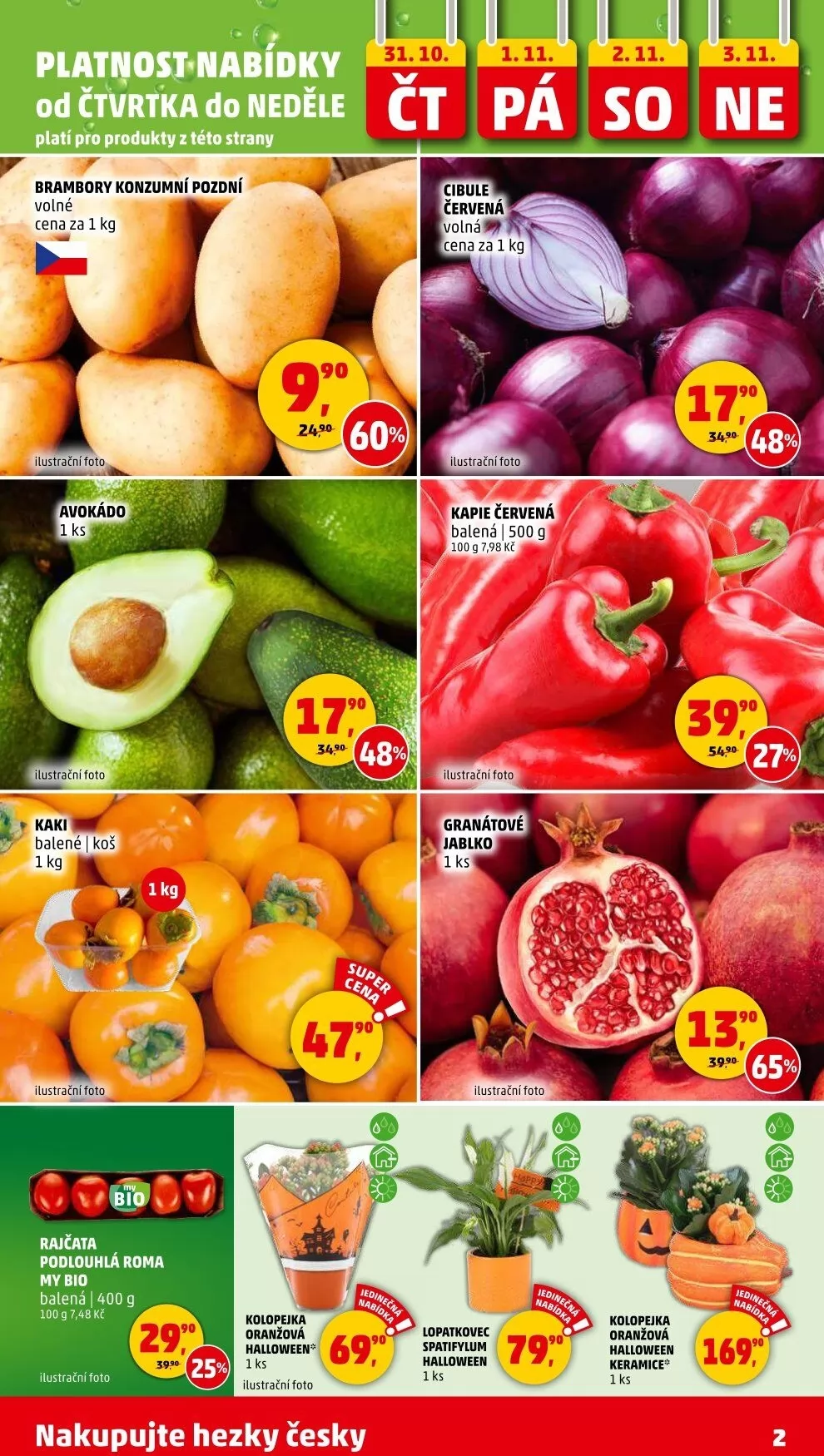 V letáku obchodu Penny Market najdete skvělé nabídky na čerstvé produkty, které platí od čtvrtka do neděle. Mezi nimi jsou konzumní brambory za výhodnou cenu, avokádo a kaki v balení po 1 kg. Dále si můžete pořídit podlouhlá rajčata Roma v bio kvalitě, červenou cibuli a červenou kapie. Nezapomeňte také na granátové jablko a dekorativní kolopejku v oranžové barvě, ideální pro Halloween. Všechny produkty jsou pečlivě vybrané a nabízené za skvělé ceny. Nakupujte hezky česky!