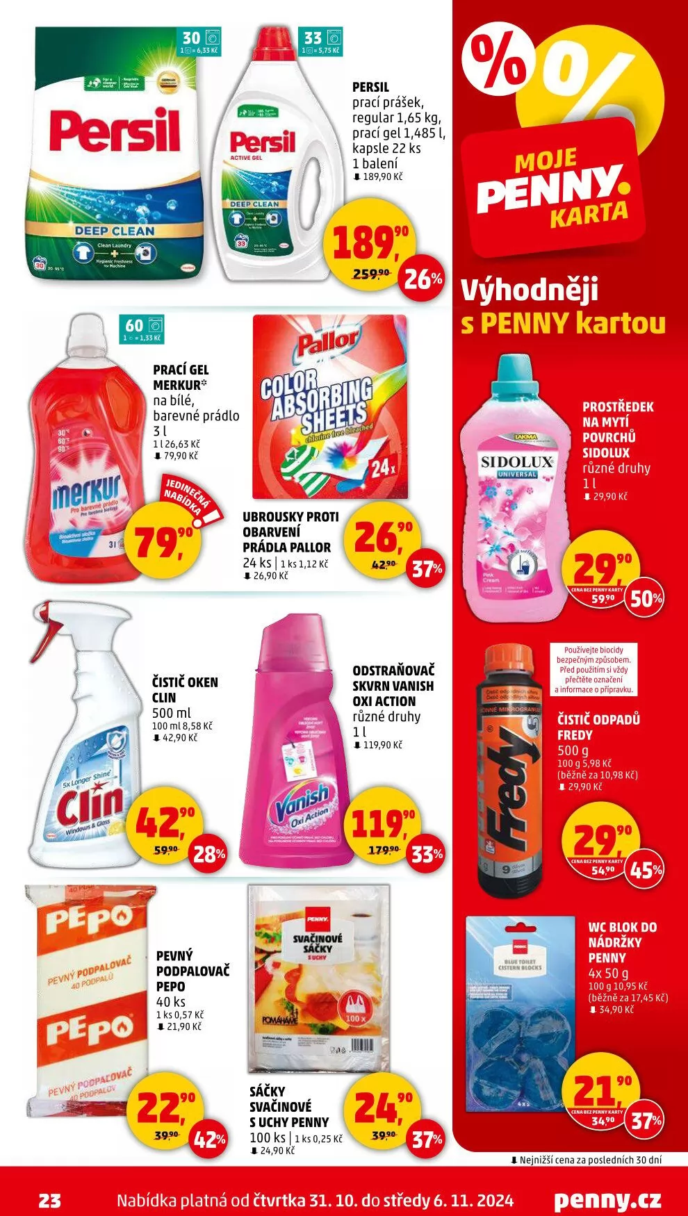 V letáku obchodu Penny Market najdete širokou nabídku produktů pro domácnost a úklid. Mezi nimi se objevují oblíbené prací prášky a gely značky Persil, které jsou k dispozici v různých variantách. Čistič oken Clin a prostředek na mytí povrchů Sidolux zajistí, že vaše domácnost bude vždy čistá a svěží.