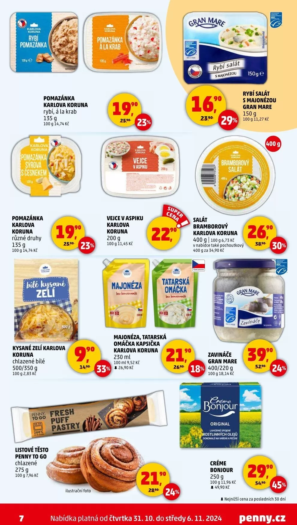 V letáku obchodu Penny Market najdete širokou nabídku rybích pomazánek a salátů. Mezi nimi se objevuje rybí pomazánka Karlova Koruna á la krab (135 g) za 14,74 Kč/100 g a rybí salát s majonézou Gran Mare (150 g) za 11,27 Kč/100 g. Dále je k dispozici vejce v aspiku Karlova Koruna (200 g) za 11,45 Kč/100 g a pomazánka s česnekem (135 g) za 14,74 Kč/100 g.