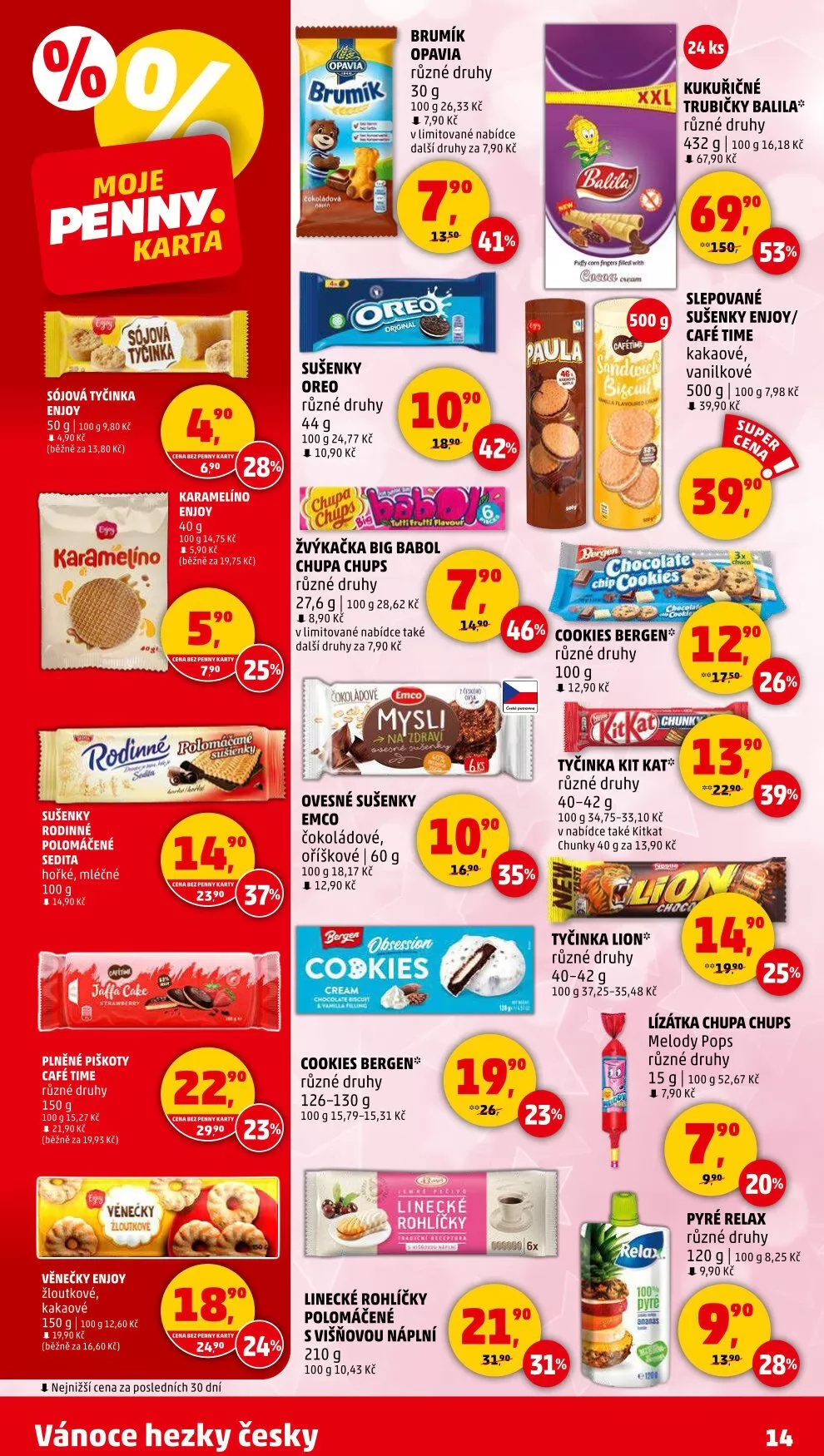 V letáku obchodu Penny Market najdete širokou nabídku chutných produktů. Mezi oblíbené sušenky patří Oreo v různých druzích, které jsou k dostání za 10,90 Kč za 100 g. Dále si můžete vychutnat Brumíka od Opavia za 7,90 Kč za 100 g. V limitované nabídce jsou také kukuřičné trubičky Pavla za 67,90 Kč za 432 g.