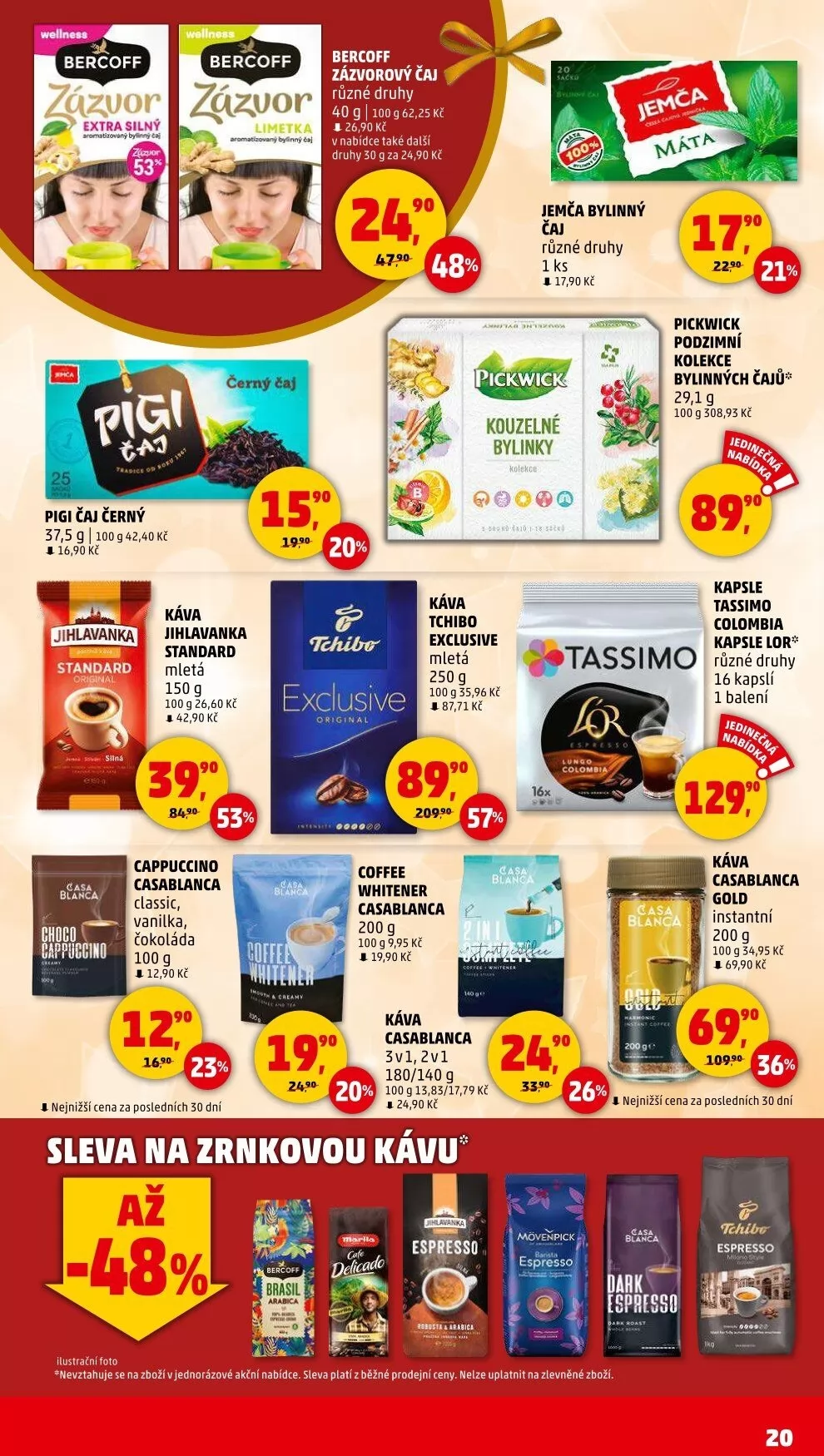 V letáku obchodu Penny Market najdete širokou nabídku čajů a káv. Mezi čaji si můžete vybrat z černého čaje Bercoff, zázvorového čaje nebo bylinného čaje Jemča, které jsou k dispozici za výhodné ceny. Dále jsou v nabídce bylinné čaje Pickwick, včetně podzimní kolekce.