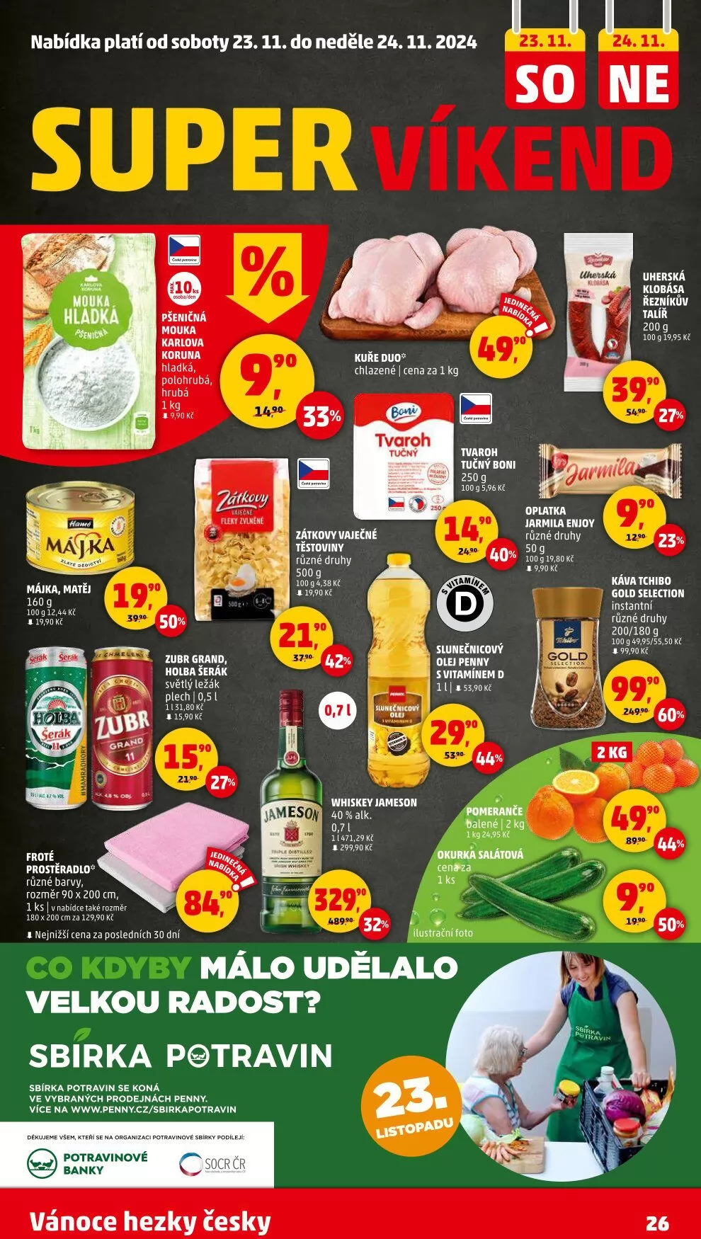 V letáku obchodu Penny Market na víkend od 23. do 24. listopadu 2024 najdete širokou nabídku produktů za skvělé ceny. Mezi nimi je hladká pšeničná mouka Karlova koruna, která je k dostání v různých typech. Dále si můžete pořídit uherskou klobásu nebo chlazené kuře duo.
