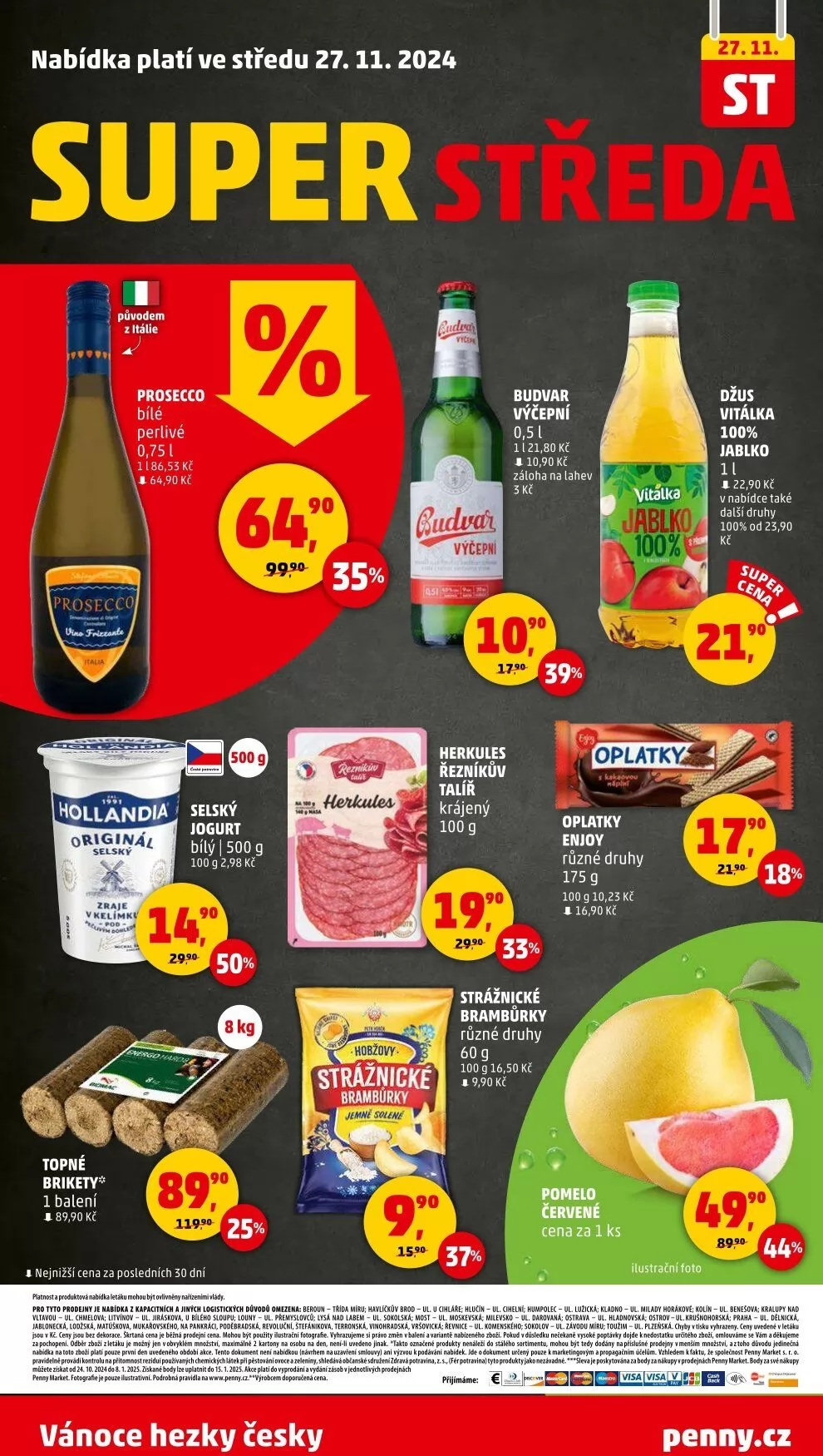 V letáku obchodu Penny Market na středu 27.11.2024 najdete širokou nabídku produktů za skvělé ceny. Mezi nimi se objevuje italské prosecco bílé perlivé 0,75 l za 64,90 Kč. Dále je v nabídce Budvar výčepní 0,51 l za 10,90 Kč.
