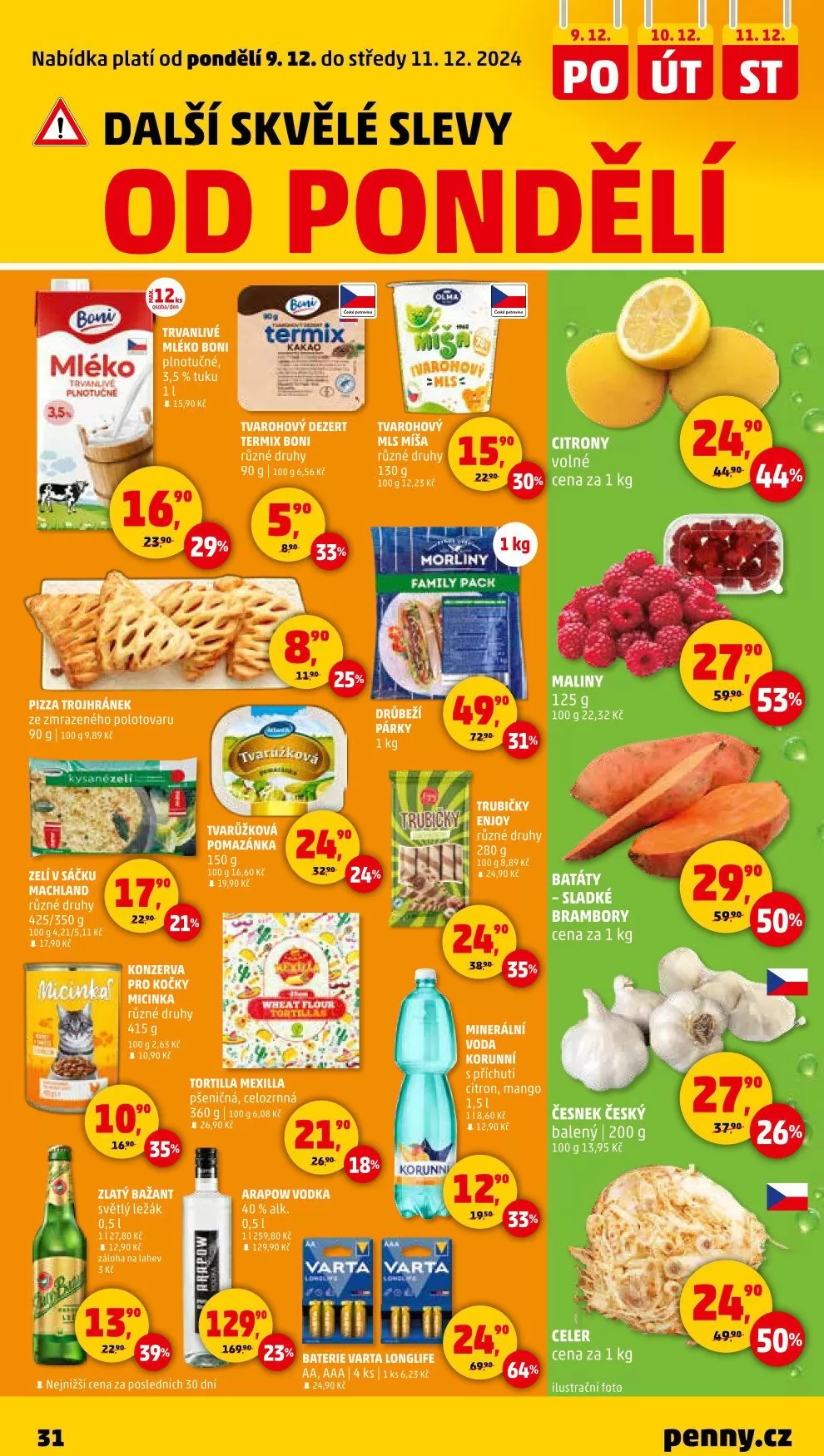 V letáku obchodu Penny Market, platném od 9. do 11. prosince 2024, najdete skvělé slevy na široký sortiment produktů. Mezi nabízenými položkami je trvanlivé mléko Boni s plnotučným obsahem tuku, pizza trojhránek ze zmrazeného polotovaru a tvarohový dezert Termix Boni v různých druzích.