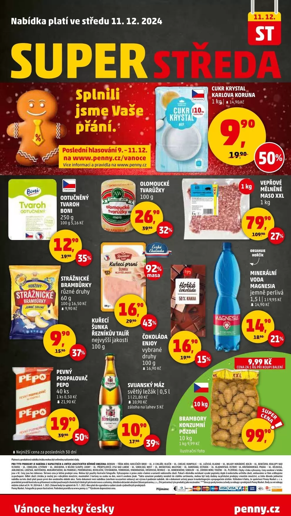 V letáku obchodu Penny Market na středu 11.12.2024 najdete širokou nabídku produktů za skvělé ceny. Mezi nimi se objevují cukr krystal Karlova koruna, odtučněný tvaroh Bonny, různé druhy brambůrek Strážnické a pevný podpalovač Pepo. Dále si můžete zakoupit olomoucké tvarůžky, vepřové mleté maso a kuřecí šunku Řezníkův talíř. Nezapomeňte také na čokoládu Enjoy a světlý ležák Svijanský máz. V nabídce jsou i konzumní brambory a minerální voda Magnesia. Využijte akční ceny a udělejte si radost kvalitními potravinami!