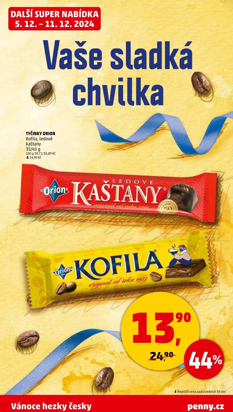 Mezi nimi se objevují oblíbené tyčinky Orion Kofila a ledové kaštany, které si můžete pořídit za výhodnou cenu 14,90 Kč za 35/45 g.