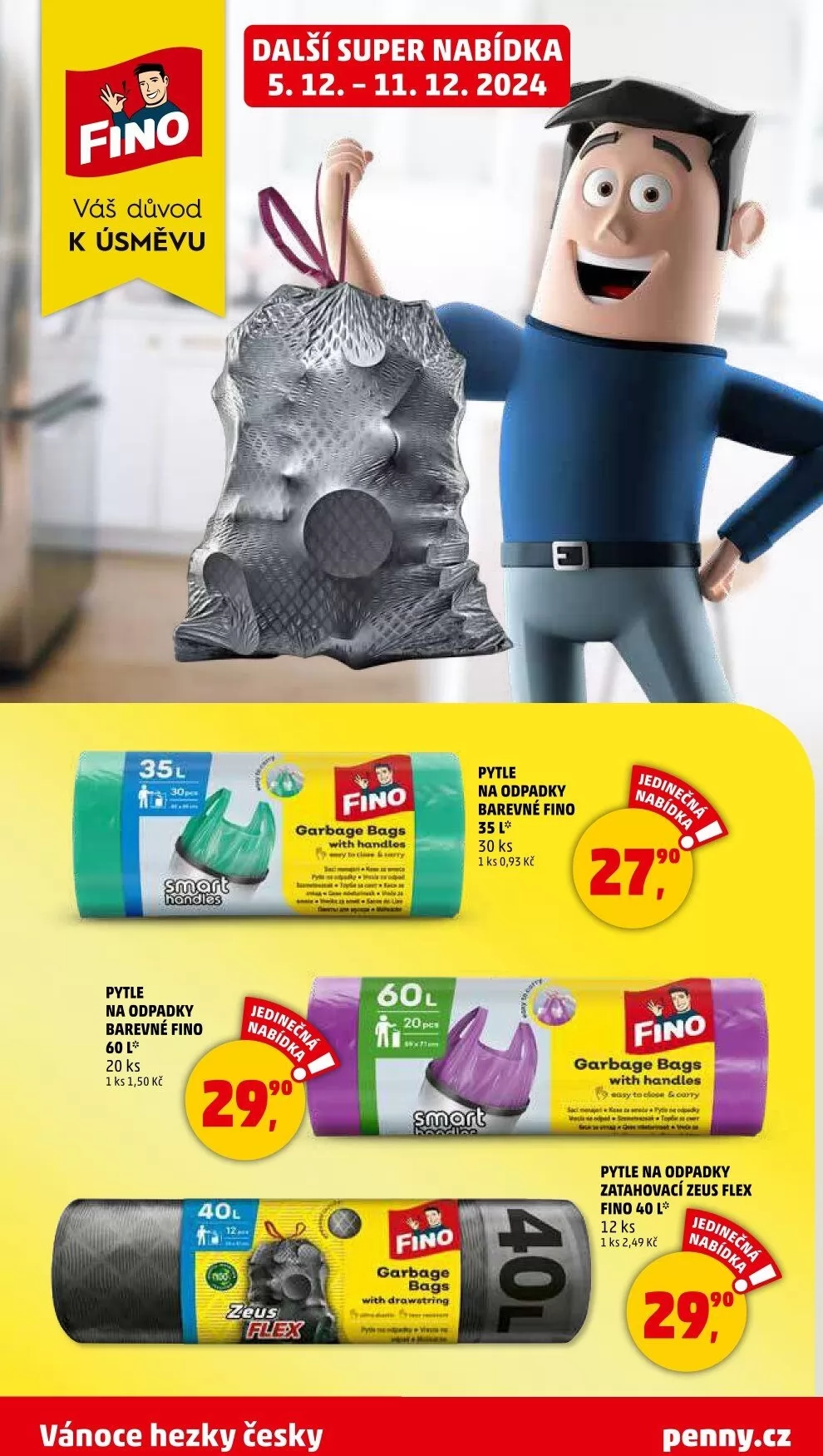 V letáku obchodu Penny Market od 5. 12. do 11. 12. 2024 najdete skvělé nabídky na pytle na odpadky značky Fino.