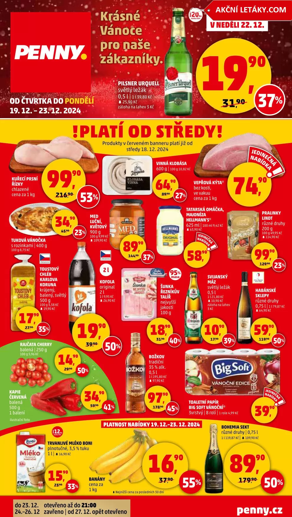 V letáku obchodu Penny Market najdete širokou nabídku produktů, které potěší každého zákazníka. Od čtvrtka do pondělí si můžete zakoupit Pilsner Urquell světlý ležák za 25,90 Kč, s zálohou na lahev 3 Kč. V neděli 22.12. platí speciální cena 19,90 Kč.