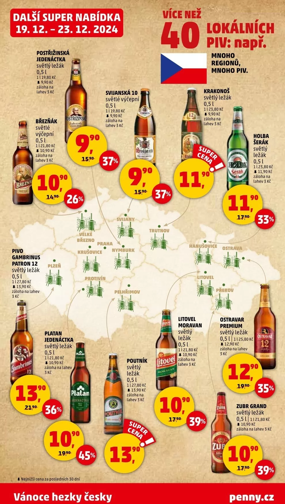 V letáku obchodu Penny Market na období od 19. 12. do 23. 12. 2024 najdete skvělé nabídky na široký výběr světlých ležáků. Mezi nimi se objevují oblíbené značky jako Postřižinská jedenáctka, Krakonoš, Březňák a Svijanská 10, všechny za atraktivní ceny. Například Postřižinská jedenáctka je k dostání za 9,90 Kč s zálohou na lahev 3 Kč.
