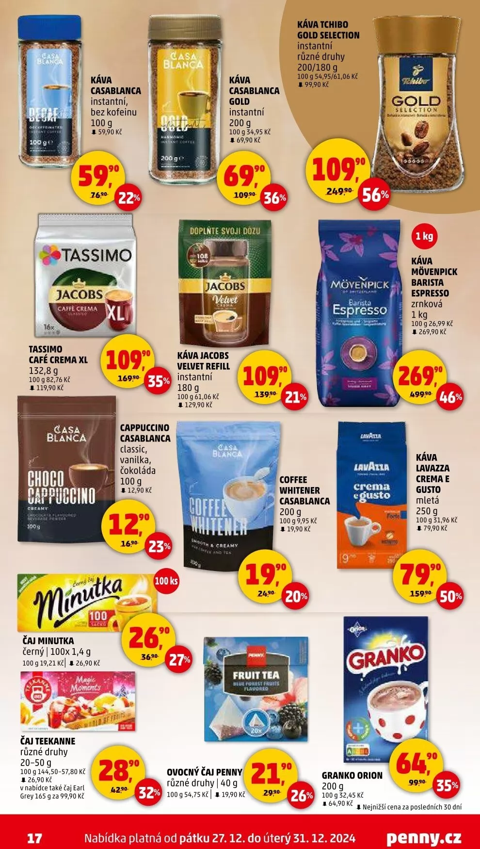 V letáku obchodu Penny Market najdete širokou nabídku káv a čajů za skvělé ceny. Mezi oblíbené produkty patří instantní káva Casablanca bez kofeinu za 59,90 Kč (100 g) a Jacobs Velvet refill za 129,90 Kč (180 g). Pokud preferujete espresso, vyzkoušejte Mövenpick Barista Espresso za 269,90 Kč (1 kg) nebo Lavazza Crema e Gusto mletou kávu za 79,90 Kč (250 g).