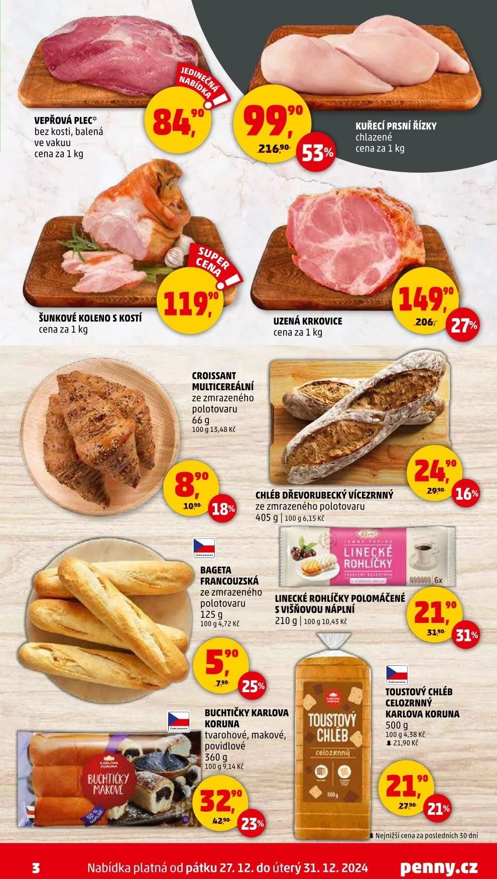 Na závěr nabízíme celozrnný toustový chléb Karlova koruna o hmotnosti 500 g za 21,90 Kč, což je nejnižší cena za poslední dny. Nabídka platí od pátku 27.12. do úterý 31.12.2024. Navštivte penny.cz pro více informací!