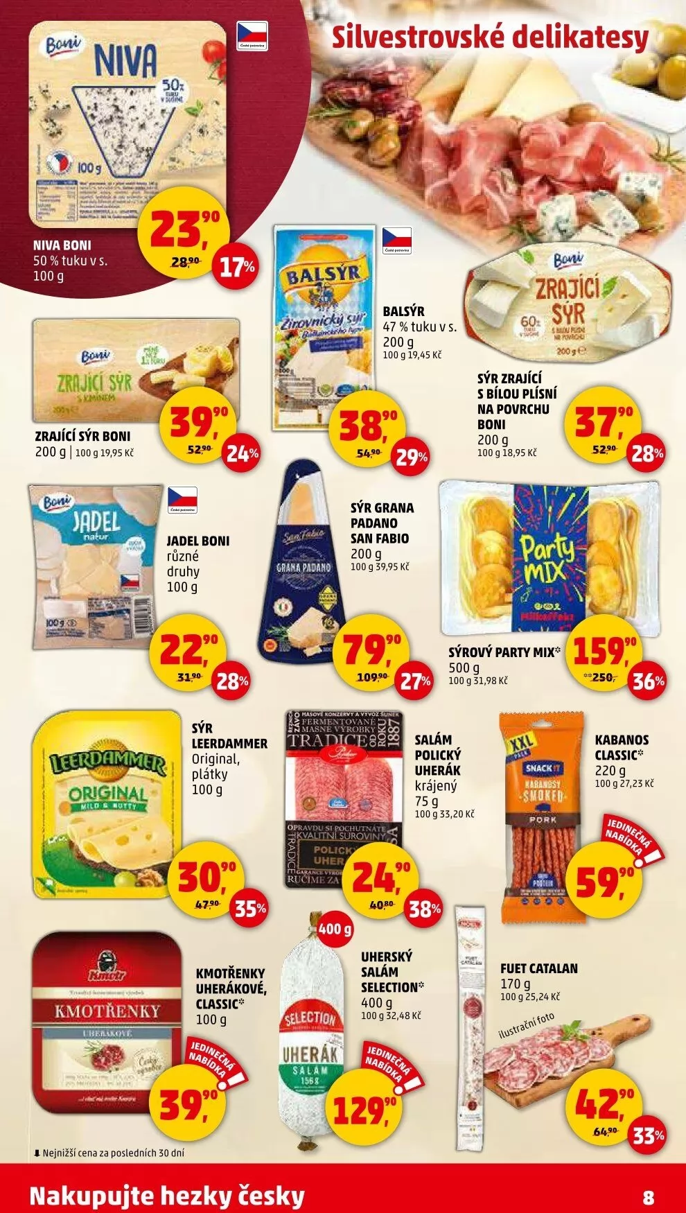 V letáku obchodu Penny Market najdete širokou nabídku silvestrovských delikates. Mezi nimi se objevují lahodné sýry jako Niva, zrající sýr Boni a Grana Padano. Nechybí ani oblíbené plátky Leerdammer a sýrový party mix, ideální pro oslavy.