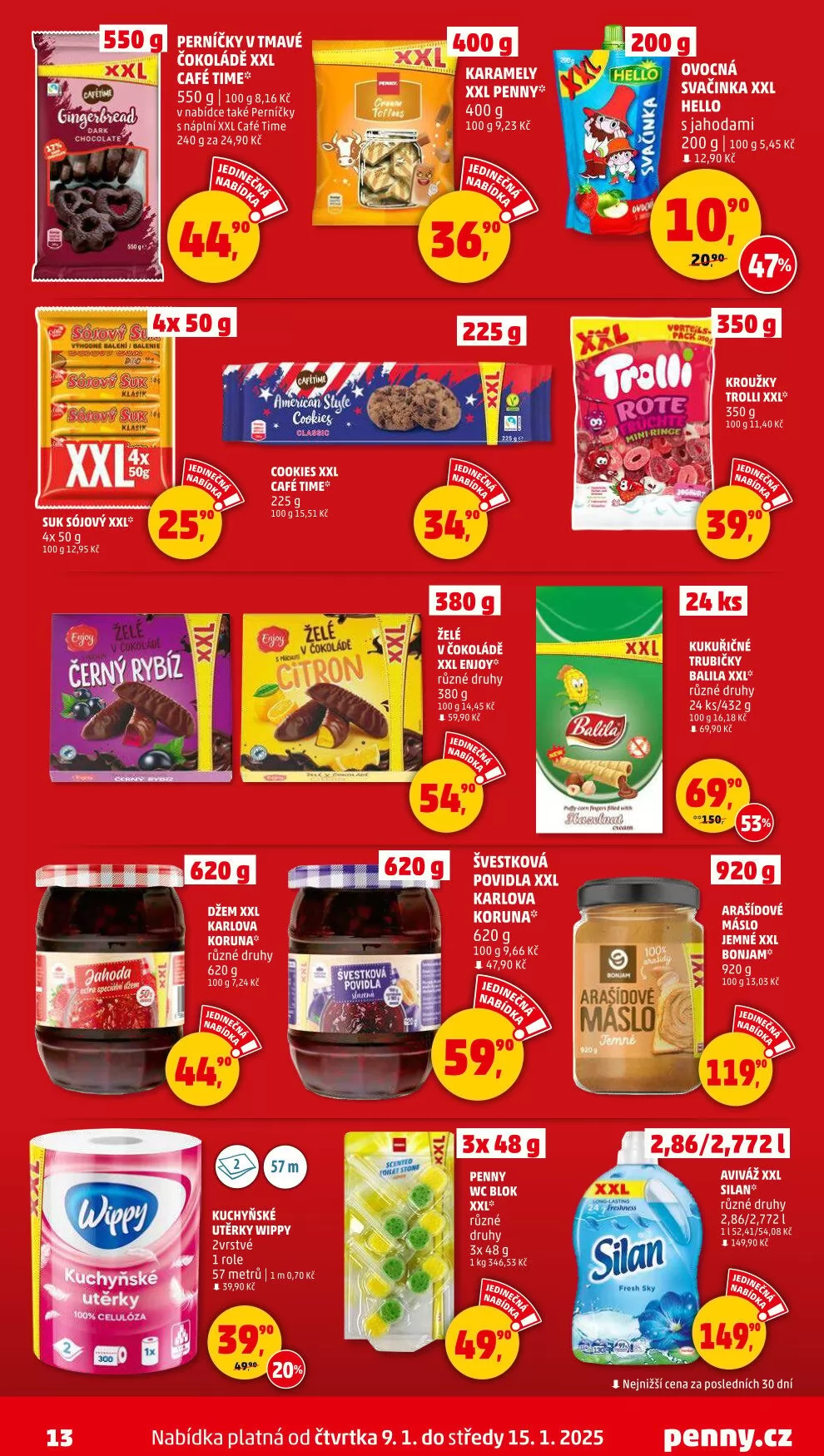 V letáku obchodu Penny Market najdete širokou nabídku produktů za skvělé ceny. Mezi novinkami se objevují perníčky v tmavé čokoládě Café Time, které jsou k dostání v balení 240 g za 24,90 Kč. Dále si můžete vychutnat karamelky Penny za 9,23 Kč na 100 g nebo lahodné sušenky Cookies Café Time, které stojí 15,51 Kč za 225 g.