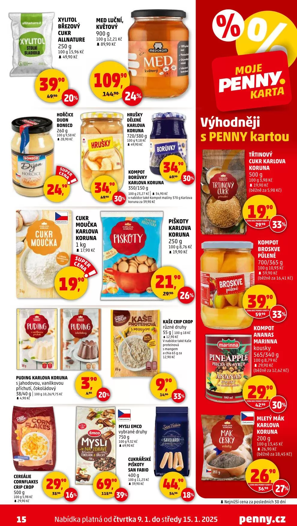 V letáku obchodu Penny Market najdete širokou nabídku produktů za výhodné ceny. Mezi nimi je březový cukr Allnature 250 g za 49,90 Kč, hořčice Dijon Boneco 260 g za 28,90 Kč a med luční květový 900 g za 89,90 Kč. Dále si můžete pořídit hrušky dělené Karlova Koruna 720/380 g za 49,90 Kč nebo borůvkový kompot 350/150 g za 30,90 Kč.