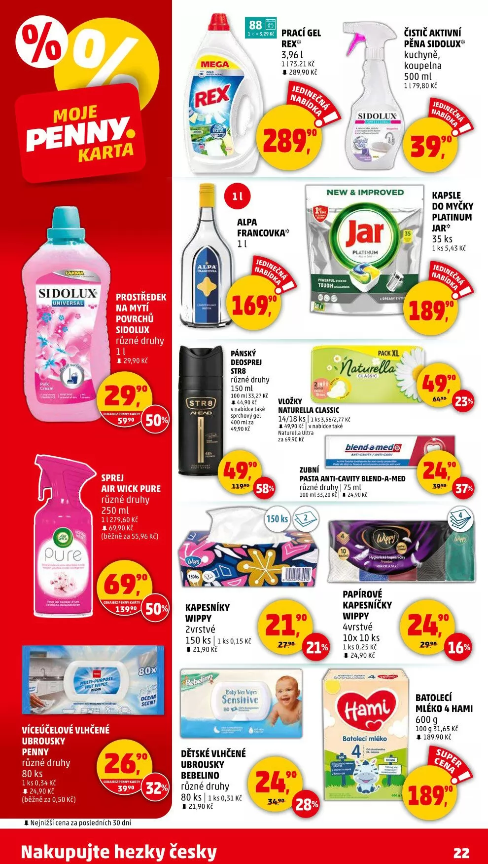 V letáku obchodu Penny Market najdete širokou nabídku produktů za skvělé ceny. Mezi nimi je prací gel za 73,21 Kč, kapesníky Wippy 2vrstvé za 24,90 Kč a čistič aktivní pěna Sidolux za 179,80 Kč. Dále nabízíme kapsle do myčky Jar Platinum za 5,43 Kč za kus a pánský deosprej Str8 za 44,90 Kč.