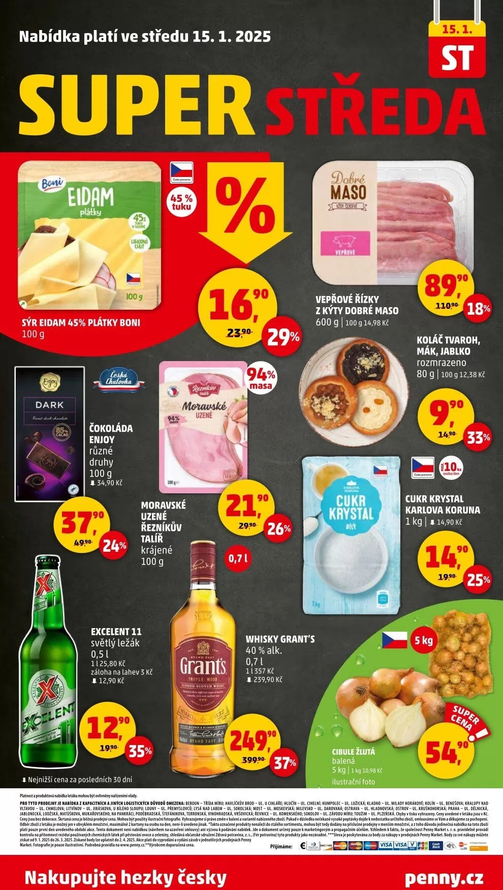 V letáku obchodu Penny Market na středu 15.1.2025 najdete širokou nabídku produktů za skvělé ceny. Mezi nimi se objevují plátky eidam sýra za 54,90 Kč za 100 g, moravské uzené na řezníkově talíři za 90 Kč za 100 g a vepřové řízky z kýty za 14,98 Kč za 100 g. Nezapomeňte také na čokoládu Enjoy a různé druhy koláčů, jako je tvarohový, makový nebo jablečný, za 12,38 Kč za 80 g. Cukr krystal Karlova koruna je k dispozici za 14,90 Kč za 1 kg. Využijte nejnižší ceny za posledních 50 dní a nakupujte hezky česky!