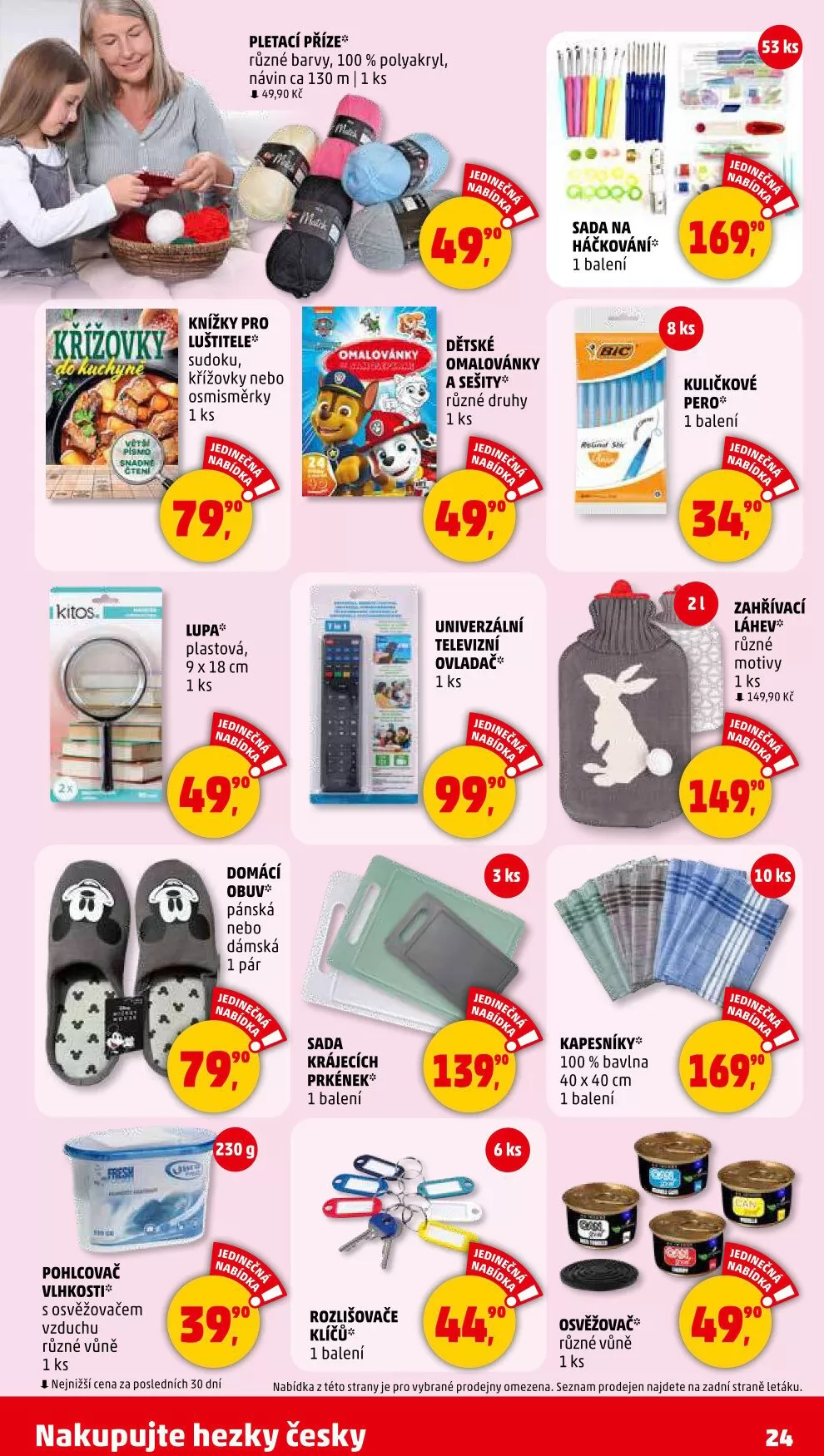 V letáku obchodu Penny Market najdete širokou nabídku produktů za skvělé ceny. Mezi nimi je pletací příze v různých barvách, 100 % polyakryl, za 49,90 Kč. Dále nabízíme pohlcovač vlhkosti s osvěžovačem vzduchu v různých vůních. Pro milovníky luštění máme knížky se sudoku, křížovkami nebo osmisměrkami.