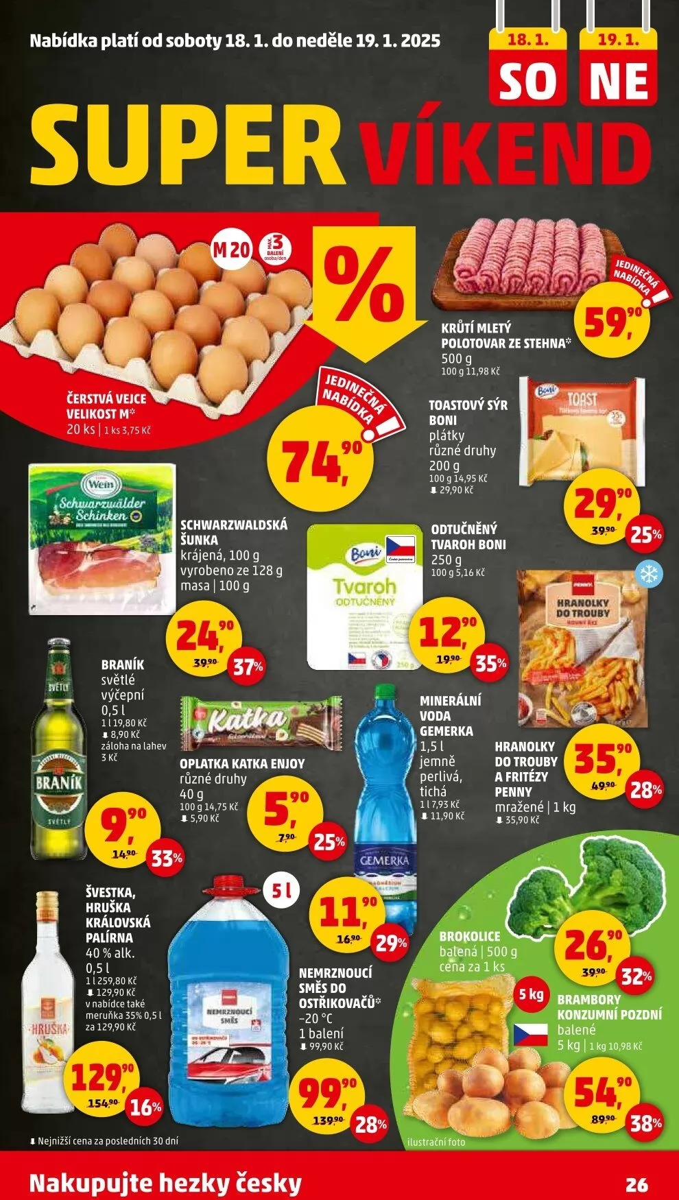V letáku obchodu Penny Market na víkend od 18. do 19. ledna 2025 najdete širokou nabídku produktů za skvělé ceny. Mezi hlavními položkami se objevuje krůtí mleté maso (500 g) a čerstvá vejce velikosti M (20 ks). Dále si můžete zakoupit schwarzwaldskou šunku (100 g) a oplatky Katka Enjoy.