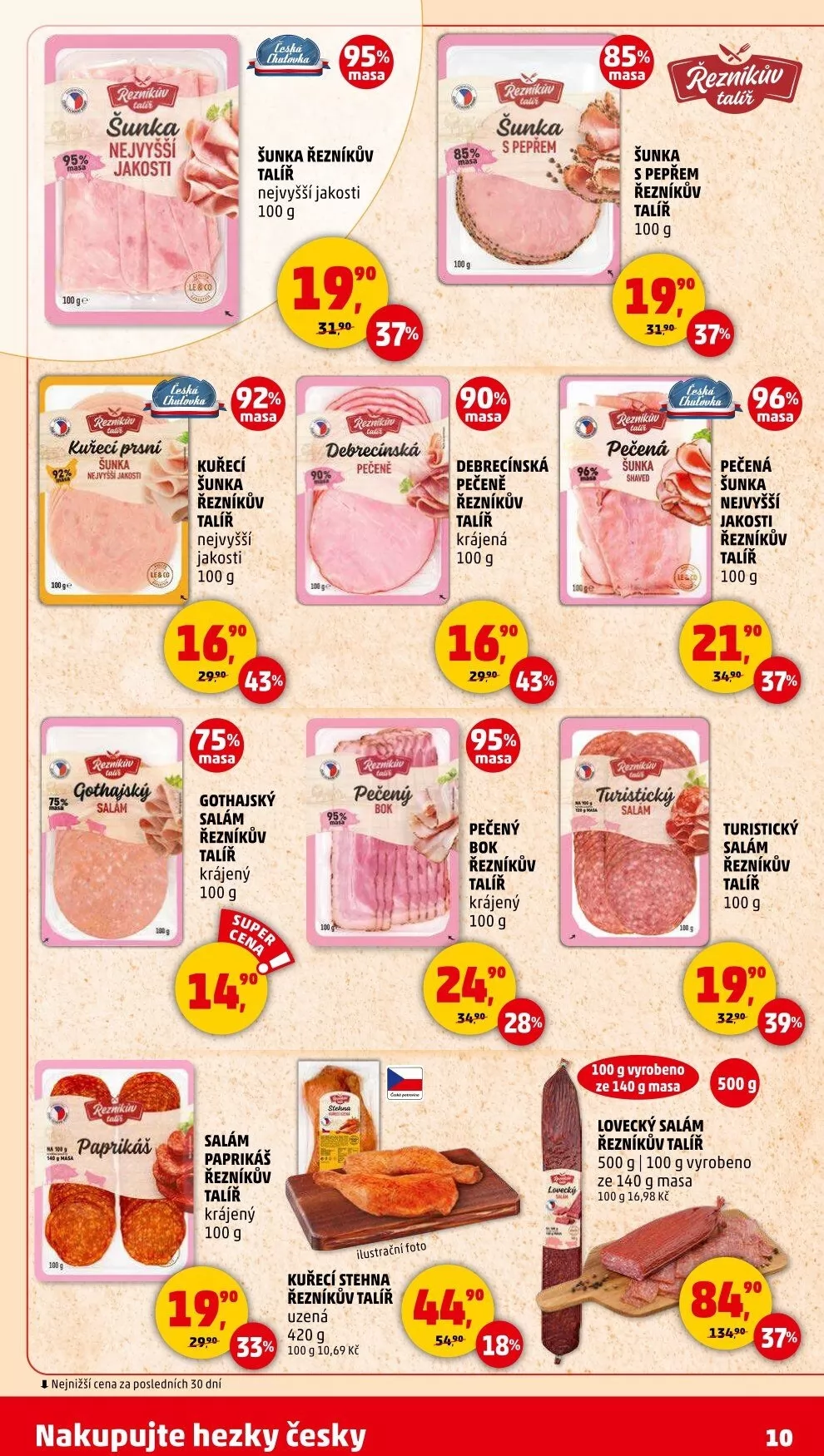 V letáku obchodu Penny Market najdete širokou nabídku kvalitních masných výrobků. Nabízíme šunky s vysokým podílem masa, jako je šunka nejvyšší jakosti s 85% masa, nebo kuřecí šunka s 90% masa, obě od řezníkův talíř. Pro milovníky salámů máme gothajský salám a salám paprikáš, oba krájené a s výbornou chutí. Nezapomeňte také na pečený bok a šunku s pepřem, které jsou ideální pro přípravu různých pokrmů. Všechny produkty jsou dostupné v praktickém balení po 100 g. Nakupujte hezky česky a využijte nejnižší ceny za posledních 50 dní!