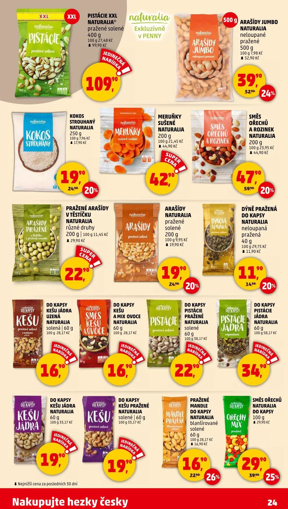 V letáku obchodu Penny Market najdete širokou nabídku kvalitních produktů značky Naturalia. Mezi nimi se objevují pražené a solené arašídy, pistácie, kokos strouhaný a sušené meruňky. Například pražené arašídy v různých variantách jsou k dispozici v balení 200 g za 19,90 Kč, zatímco pistácie v solené variantě můžete pořídit za 22,90 Kč v balení 60 g.