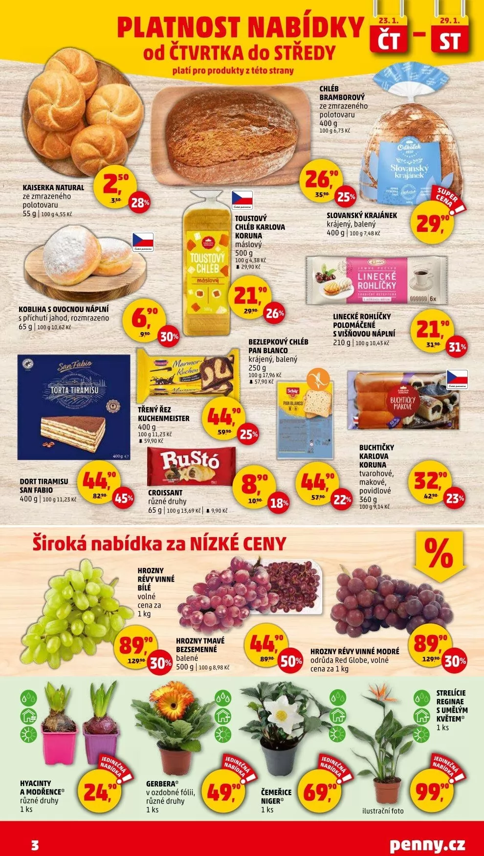V letáku obchodu Penny Market najdete širokou nabídku produktů za výhodné ceny. Od čtvrtka do středy můžete zakoupit chléb, včetně bramborového a bezlepkového, nebo lahodné kaiserky a koblihy s ovocnou náplní. Nechybí ani dort tiramisu a různé druhy croissantů.