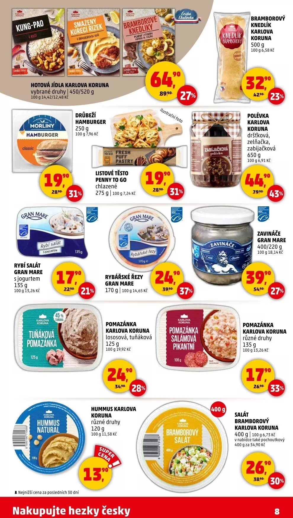V letáku obchodu Penny Market najdete širokou nabídku hotových jídel a pomazánek značky Karlova Koruna a Gran Mare. Mezi vybrané produkty patří například rybí salát, tuňáková pomazánka a drůbeží hamburger. Všechny produkty jsou cenově dostupné, s cenami od 6,58 Kč za 100 g.