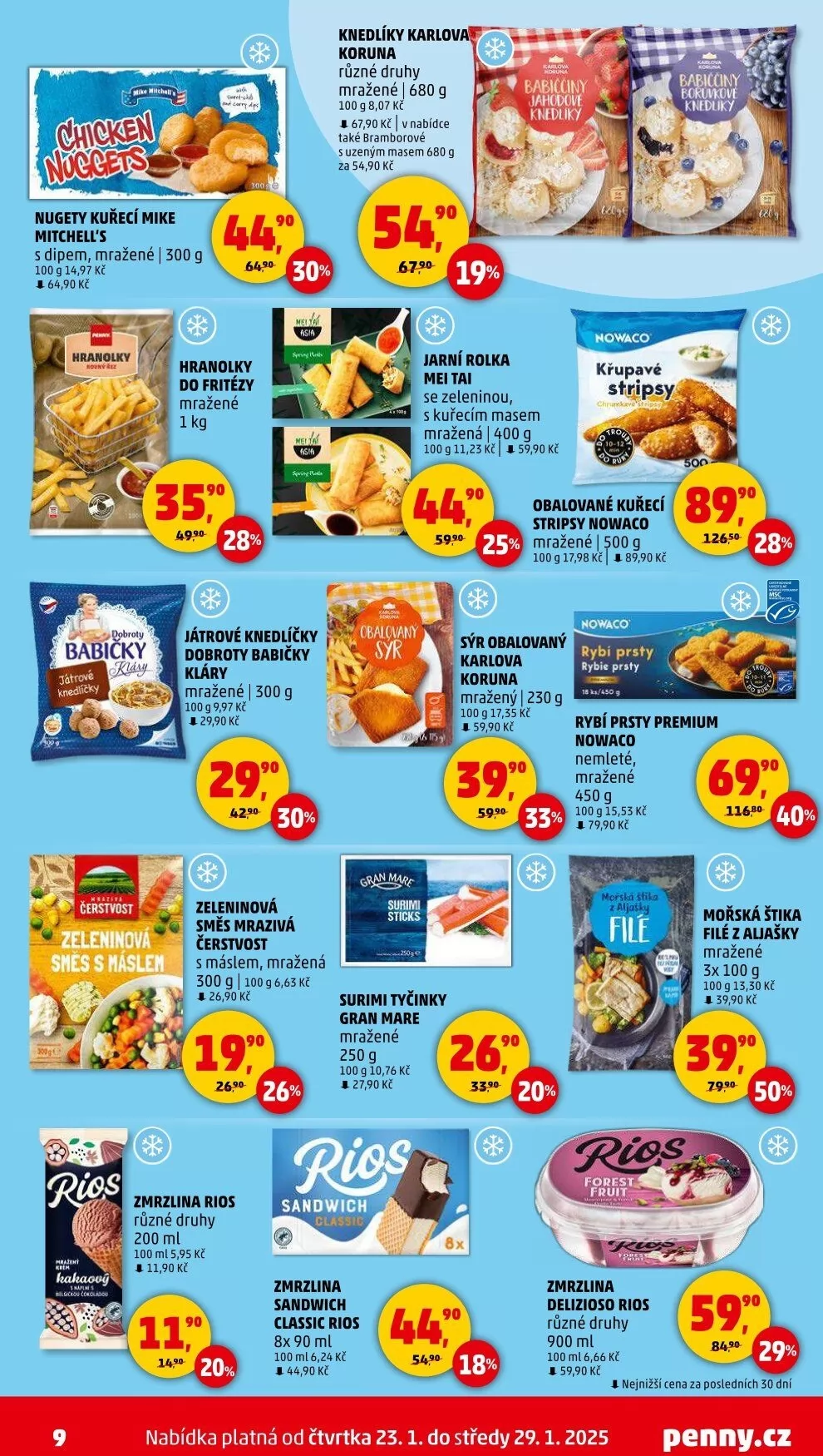 V letáku obchodu Penny Market najdete širokou nabídku mražených produktů. Mezi nimi jsou kuřecí stripsy s dipem od značky Mitchel's, které jsou k dostání v balení 300 g za 64,90 Kč. Dále si můžete vybrat z různých druhů mražených knedlíků Karlova koruna, které stojí 67,90 Kč za 680 g.