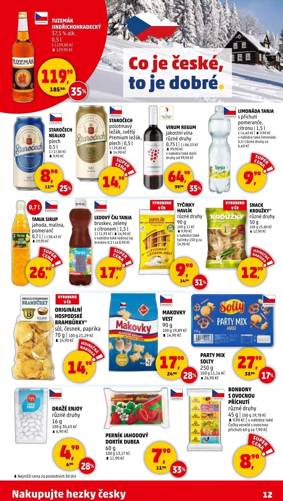 V letáku obchodu Penny Market najdete širokou nabídku produktů za skvělé ceny. Mezi nimi se objevují tuzemáky, jako je Jindřichohradecký s 37,5 % alkoholu za 129,90 Kč. Pro milovníky nealko nápojů je k dispozici Staročech v plechovce za 9,90 Kč.