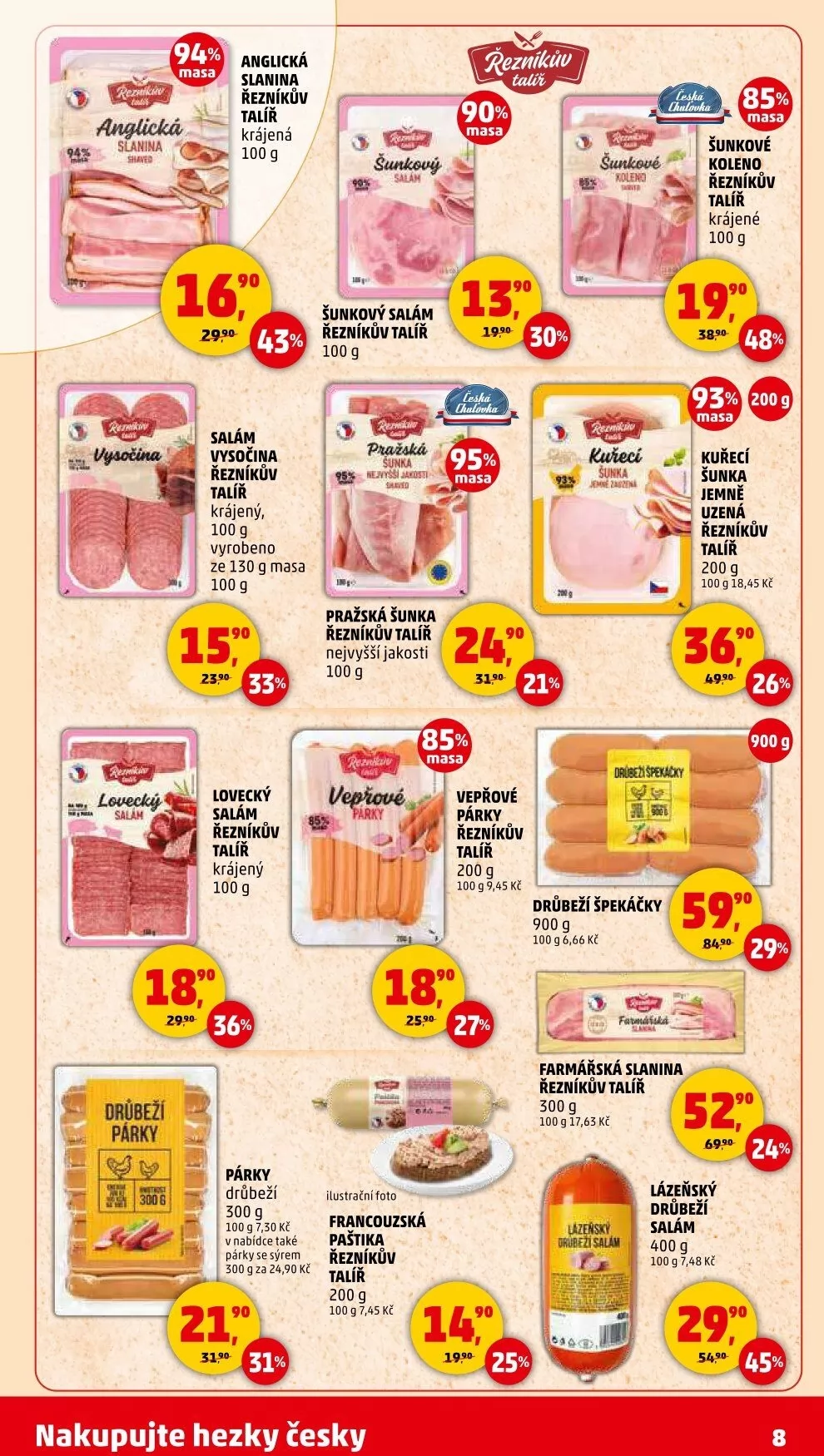 V letáku obchodu Penny Market najdete širokou nabídku kvalitních masných výrobků. Mezi nimi se objevují oblíbené anglické slaniny, šunkové salámy a pražské šunky nejvyšší jakosti, všechny v praktickém krájeném balení po 100 g. Dále si můžete vybrat z drůbežích párků, které jsou k dispozici také se sýrem, nebo z vepřových párků a farmářské slaniny. Nechybí ani lahodná francouzská paštika a jemná kuřecí šunka. Všechny produkty jsou vyrobeny z kvalitního masa a nabízejí skvělou chuť za výhodné ceny. Nakupujte hezky česky!