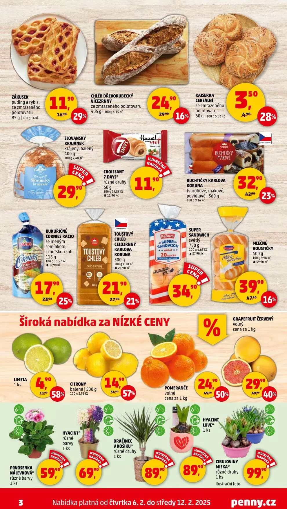 V letáku obchodu Penny Market najdete širokou nabídku polotovarů a pečiva za skvělé ceny. Mezi nabízenými produkty jsou například krájený krajánek (400 g) a různé druhy croissantů 7 days (60 g) za 11,90 Kč. Dále si můžete vybrat celozrnný toustový chléb od Penamu nebo kukuřičné s lněným semínkem (115 g) za 15,57 Kč/100 g.