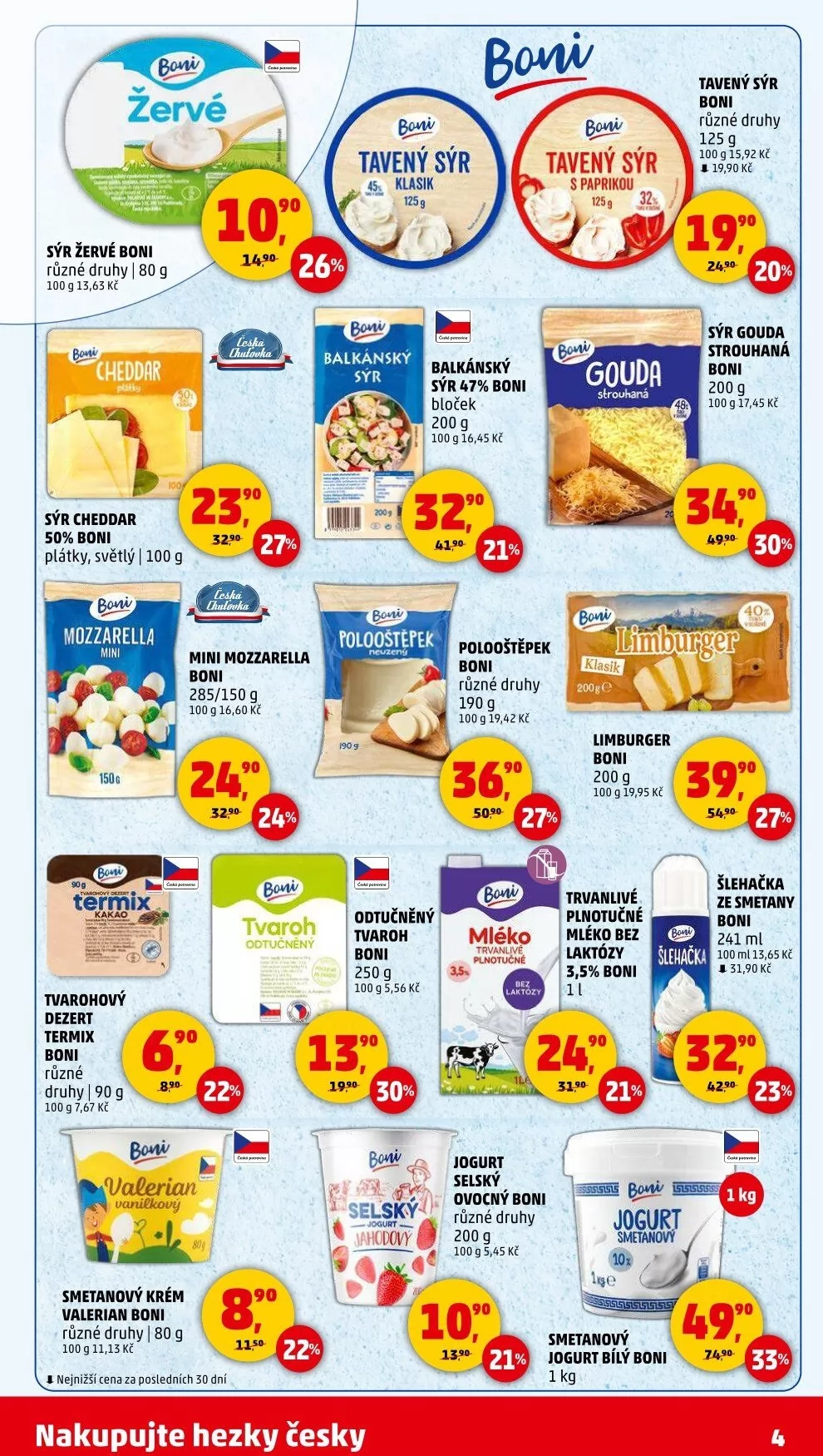 V letáku obchodu Penny Market najdete širokou nabídku mléčných produktů. Mezi nimi se objevují různé druhy sýra, jako je sýr žervé, tavený sýr klasik a gouda. Nabídka zahrnuje také mini mozzarellu a balkánský sýr v různých variantách.