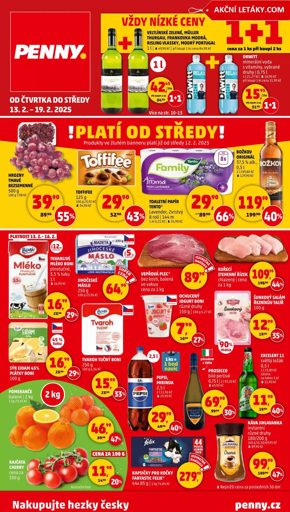 V letáku obchodu Penny Market od čtvrtka 13. do středy 19. února 2025 najdete širokou nabídku produktů za vždy nízké ceny. Mezi nabízenými víny jsou veltlínské zelené, müller thurgau, frankovka modrá, risling vlašský a modrý portugal, přičemž cena začíná na 49,90 Kč.