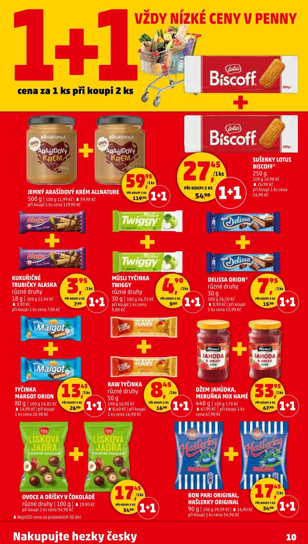 V letáku obchodu Penny Market najdete širokou nabídku produktů za vždy nízké ceny. Mezi zajímavé akce patří jemný arašídový krém Allnature, který při koupi 2 ks pořídíte za 59,90 Kč. Sušenky Lotus Biscoff jsou k dostání za 26,90 Kč při koupi 1 ks. Müsli tyčinky Twiggy a různé druhy kukuřičných trubiček Alaska jsou také v akci, cena začíná na 7,90 Kč.