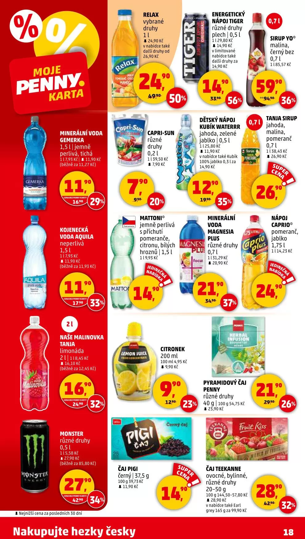 V letáku obchodu Penny Market najdete širokou nabídku nápojů a minerálních vod. Například minerální voda Gemerka je k dispozici za 1,5 l jemně perlivá nebo tichá za 11,27 Kč. Kojenecká voda Aquila je neperlivá a stojí 11,95 Kč.