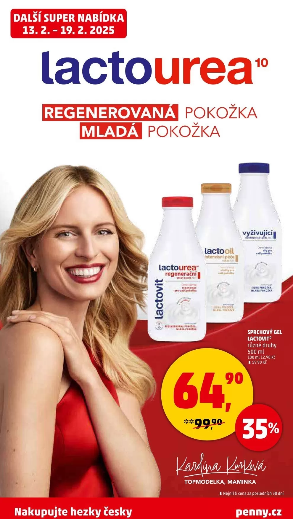 V letáku obchodu Penny Market na období od 13. 2. do 19. 2. 2025 najdete skvělé nabídky na produkty péče o pokožku. Mezi nimi je regenerující sprchový gel Lactovit v různých druzích, který je k dispozici v balení 500 ml za cenu 59,90 Kč. Dále si můžete pořídit intenzivní péči Lactooil s obsahem lactourey, která je ideální pro regeneraci pokožky. Nezapomeňte, že nyní platí nejnižší cena za posledních 50 dní! Nakupujte hezky česky a využijte tyto výhodné nabídky na penny.cz.
