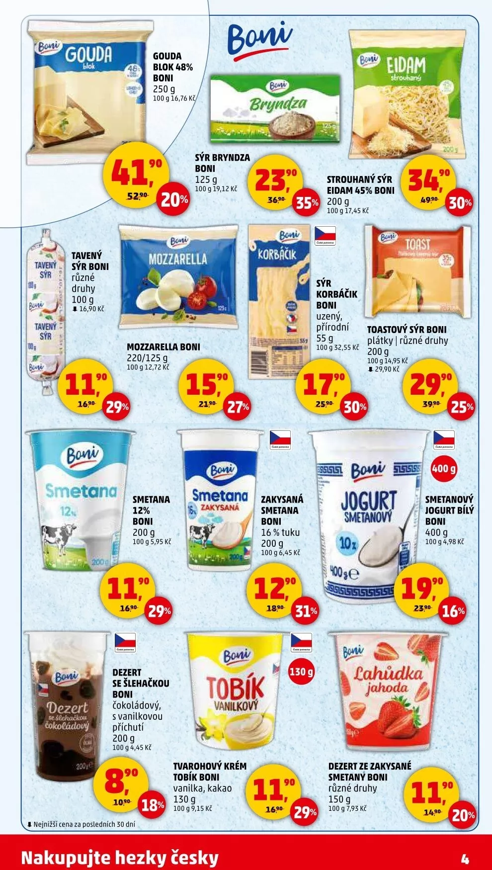 Mezi dalšími produkty se objevuje sýr bryndza Boni, mozzarella a zakysaná smetana s 16 % tuku, která stojí 6,45 Kč za 100 g.