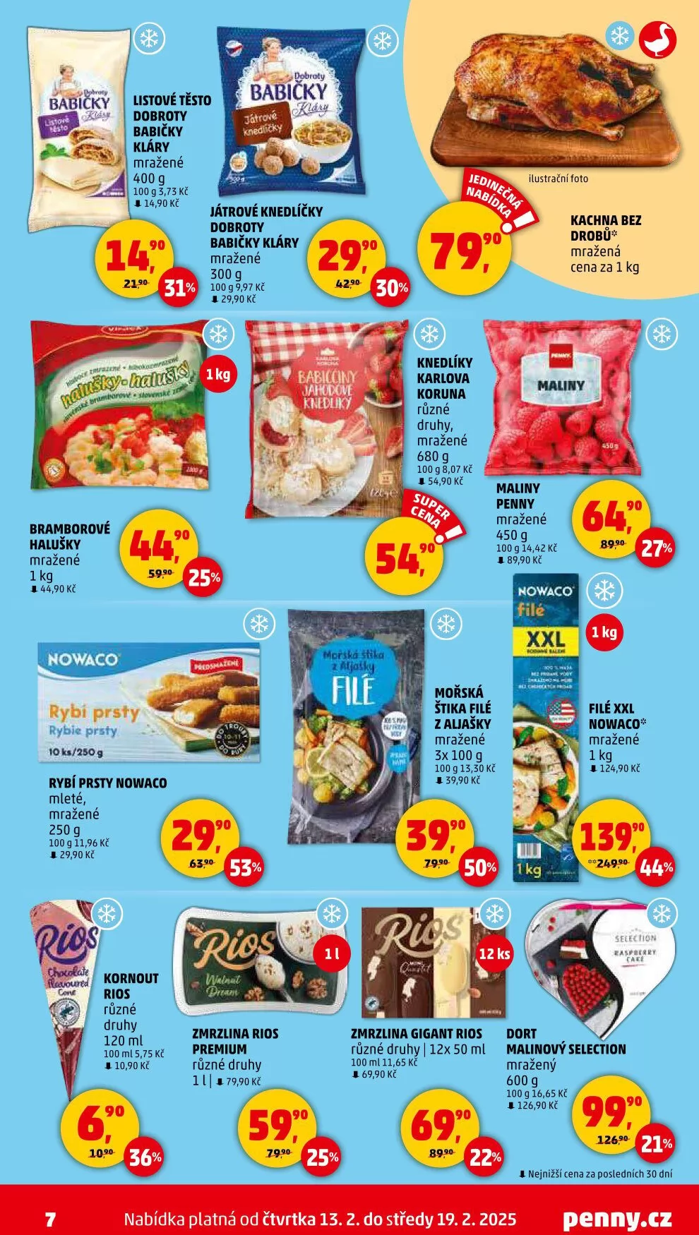 V letáku obchodu Penny Market najdete širokou nabídku mražených produktů. Mezi nimi se objevují lahodné dobroty od Babičky Kláry, jako jsou játrové knedlíčky a listové těsto. Dále si můžete vybrat z mražené kachny bez drobů, bramborových halušek nebo rybích prstů Nowaco.