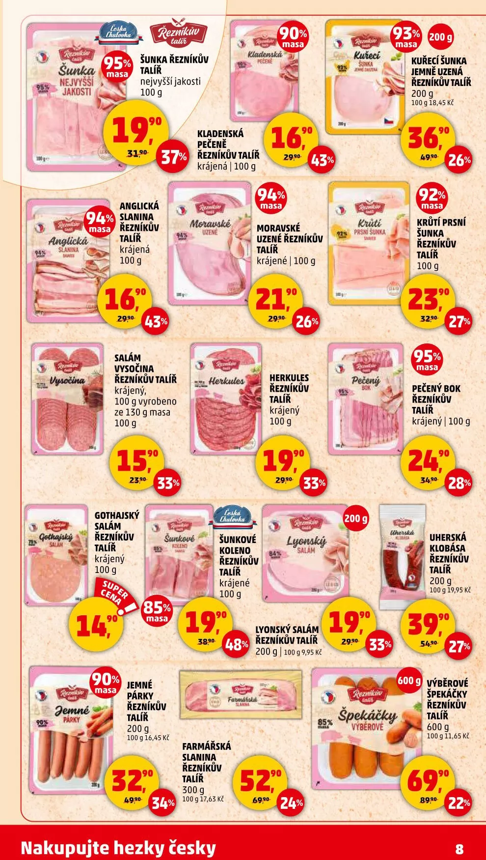 V letáku obchodu Penny Market najdete širokou nabídku kvalitních masných výrobků. Mezi nimi se objevují šunky nejvyšší jakosti, jako je nezníkův šunka a kladenská pečená šunka, obě krájené na 100 g. Dále si můžete vybrat z anglické slaniny, salámu vysočina, moravského uzeného a herkulesu, všechny s vysokým podílem masa.