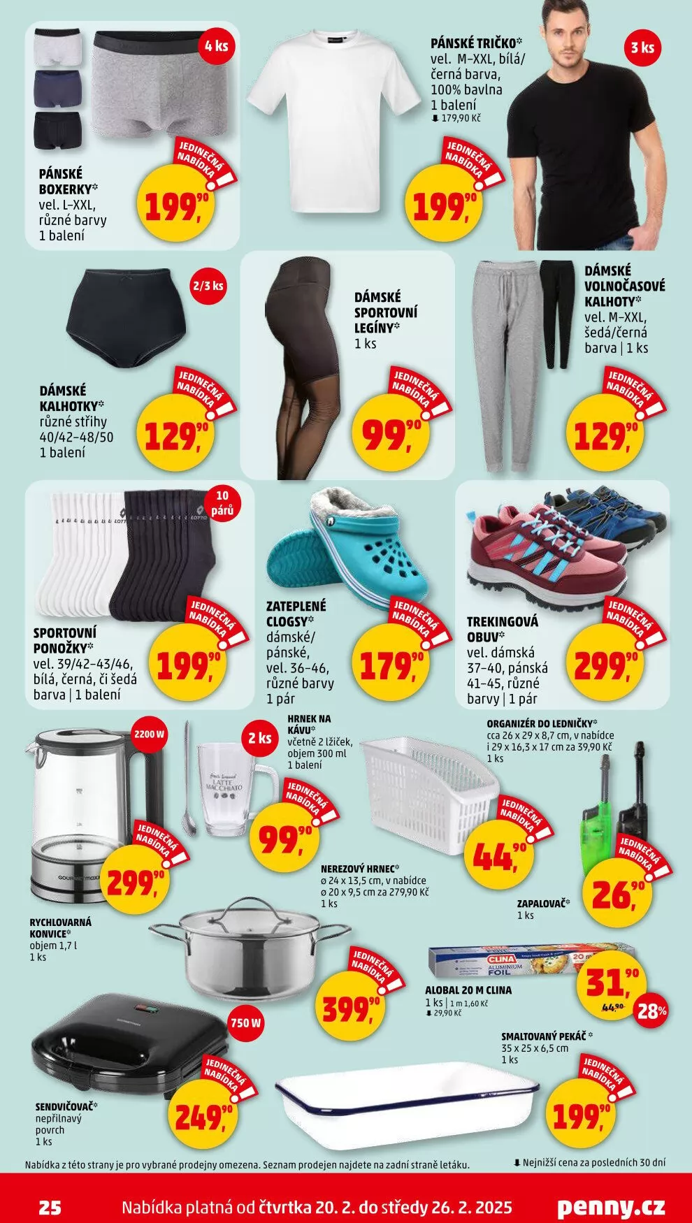 V letáku obchodu Penny Market najdete širokou nabídku produktů pro každého. Mezi pánskými produkty si můžete vybrat boxerky ve velikostech L-XXL v různých barvách a trička z 100% bavlny. Pro dámy jsou k dispozici kalhotky v různých střizích a sportovní legíny. Nezapomněli jsme ani na pohodlné zateplené clogsy a volnočasové kalhoty.