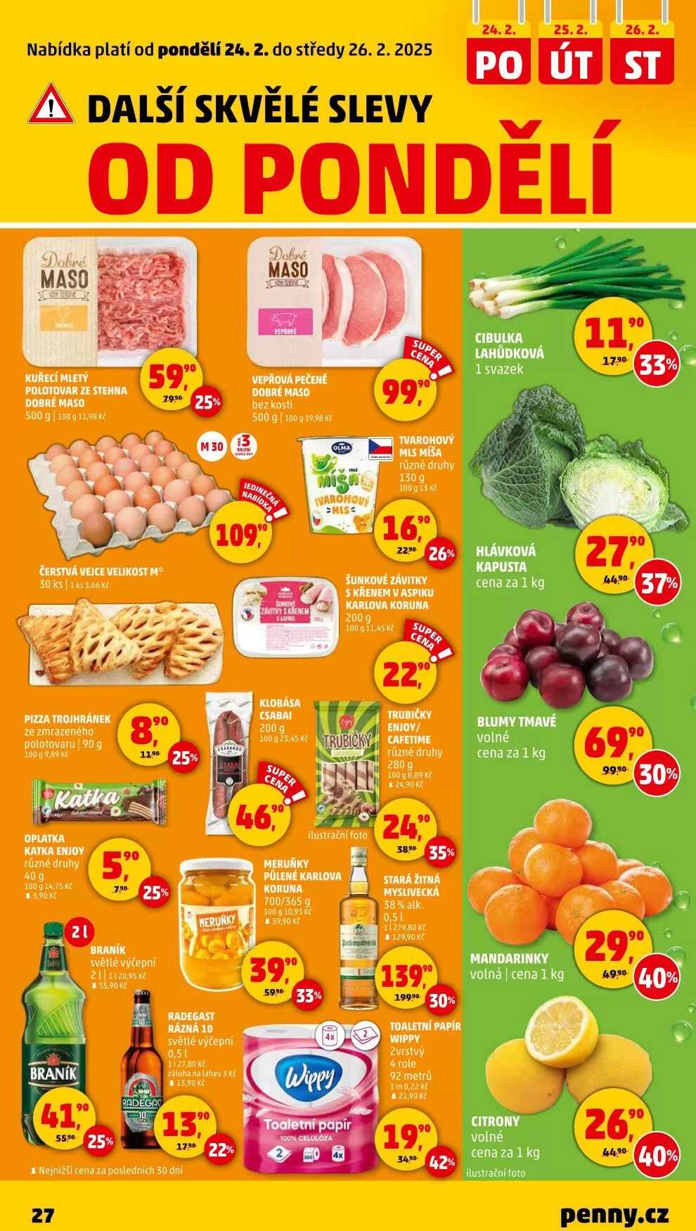 V letáku obchodu Penny Market najdete skvělé slevy na široký výběr produktů. Od pondělí 24.2. do středy 26.2.2025 si můžete zakoupit kuřecí mleté maso za 1 100 Kč za 500 g a vepřovou pečeni bez kosti za 19,98 Kč za 500 g. Dále nabízíme čerstvá vejce velikosti M a různé druhy tvarohového mlsu Míša.