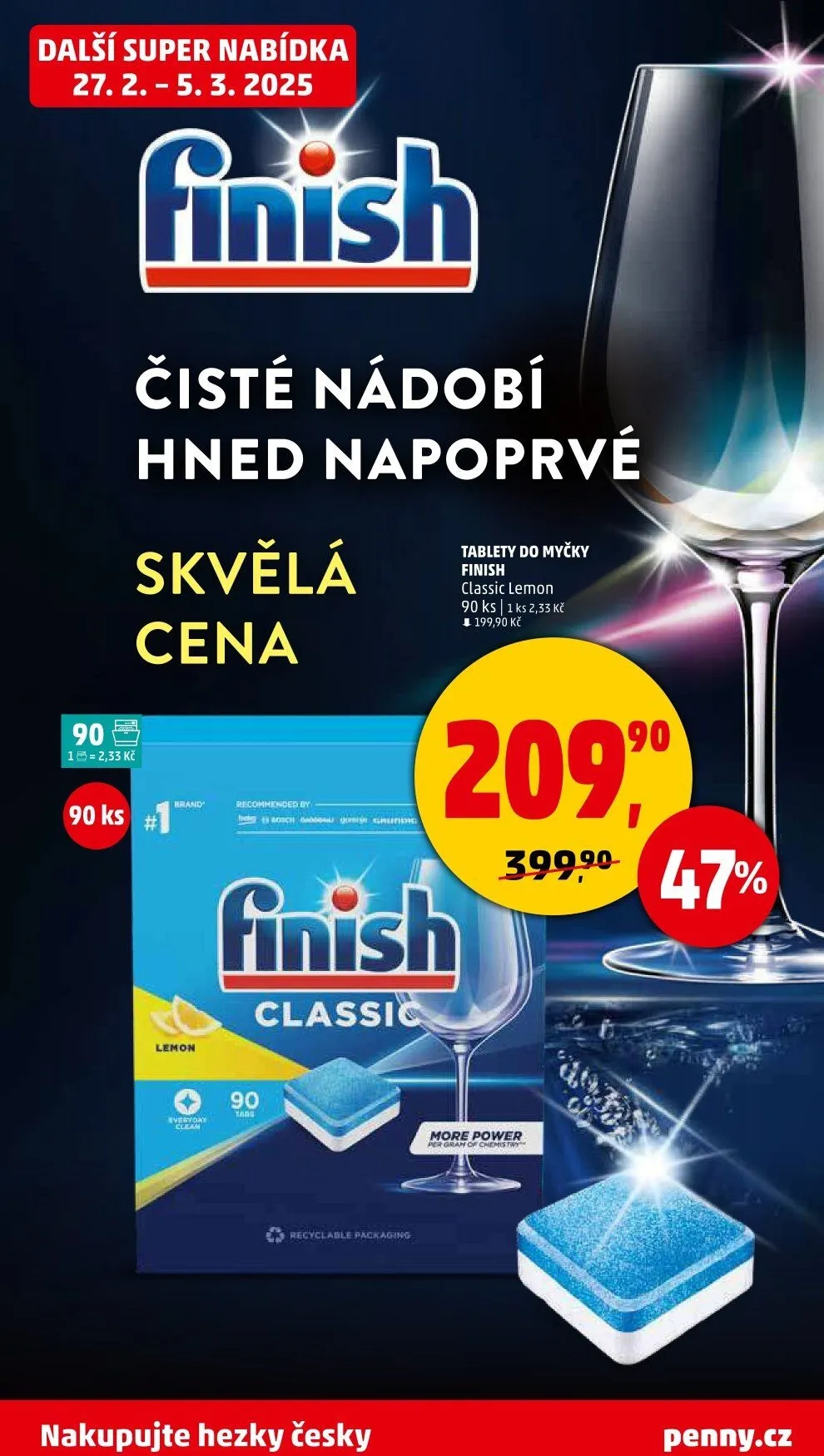 Od 27. 2. do 5. 3. 2025 si můžete pořídit tablety do myčky Finish Classic Lemon.