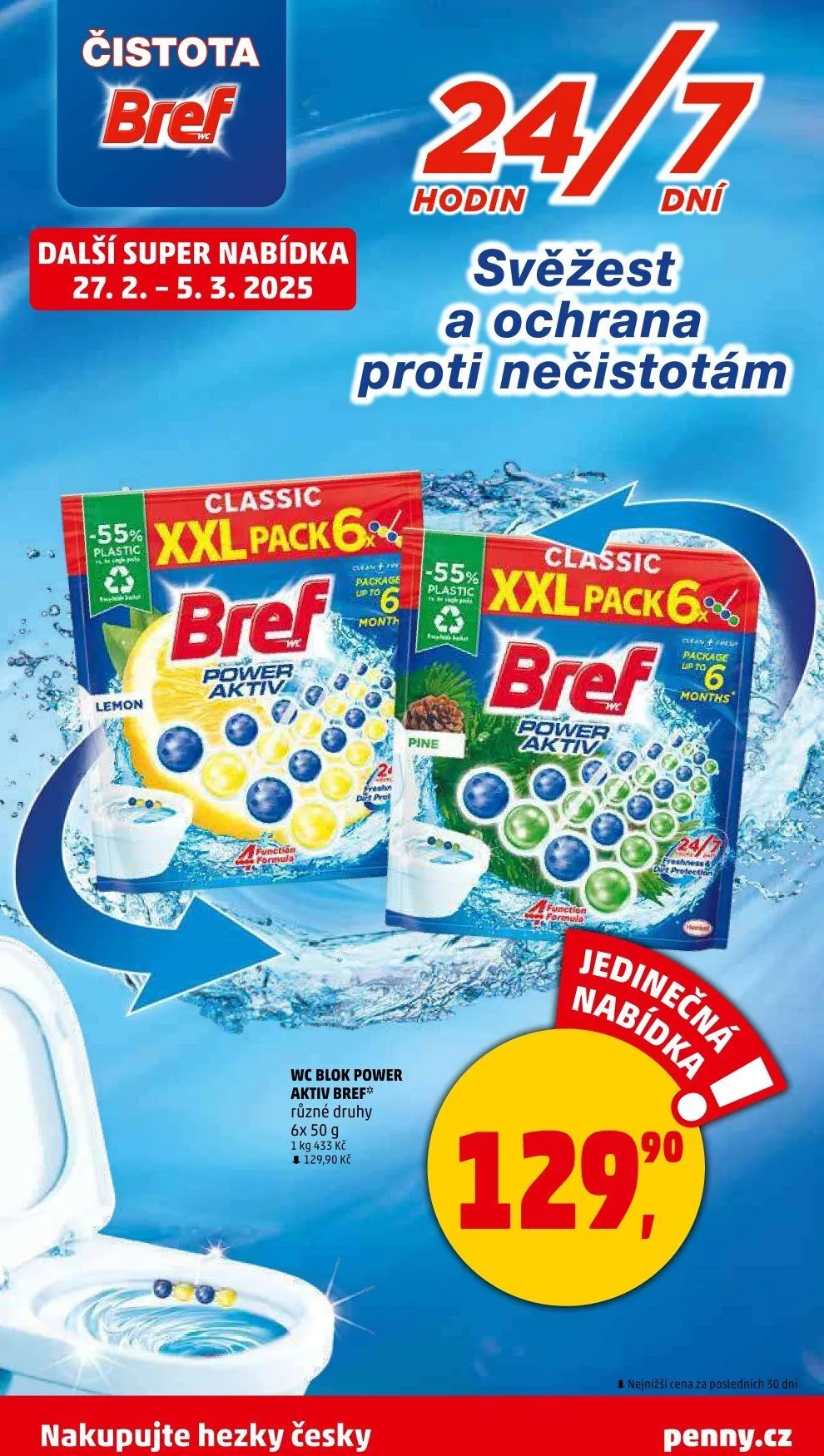 V letáku obchodu Penny Market najdete skvělé nabídky na produkty pro čistotu a svěžest. Od 27. 2. do 5. 3. 2025 si můžete pořídit WC blok Power Aktiv Bref v různých druzích, který efektivně chrání proti nečistotám. Balení obsahuje 6x 50 g a cena je 129,90 Kč, což představuje nejnižší cenu za posledních 30 dní. Nakupujte hezky česky a využijte této super nabídky!