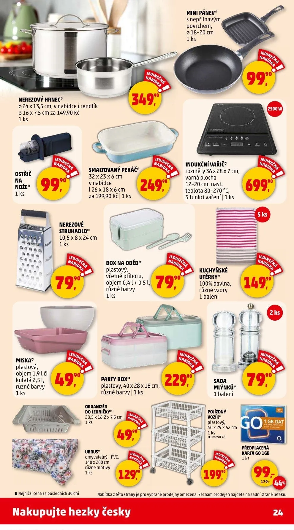 V letáku obchodu Penny Market najdete širokou nabídku praktických produktů pro vaši domácnost. Mezi nimi je nerezový hrnec o rozměrech 24x13,5 cm za 149,90 Kč, nebo ostřič na nože a miska za 99,90 Kč. Dále nabízíme smaltovaný pekáč (32x6 cm) za 199,90 Kč a nerezové struhadlo o velikosti 10,5x24 cm.