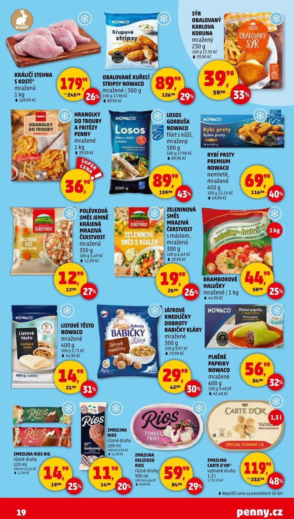 V letáku obchodu Penny Market najdete širokou nabídku mražených produktů. Mezi nimi se objevují králičí stehna s kostí za 169,90 Kč za 1 kg, nebo oblíbené hranolky do trouby v listovém těstě za 59,90 Kč za 1 kg.